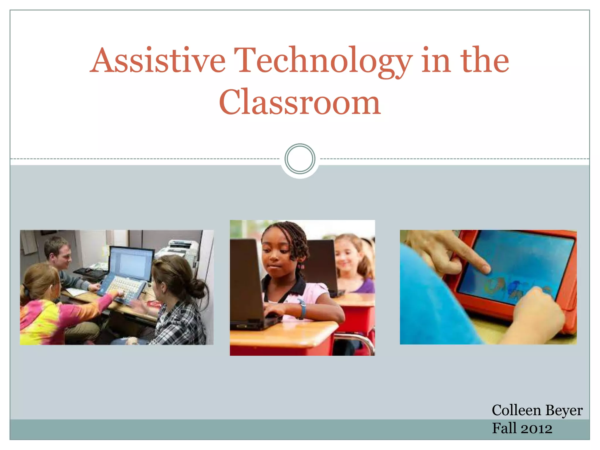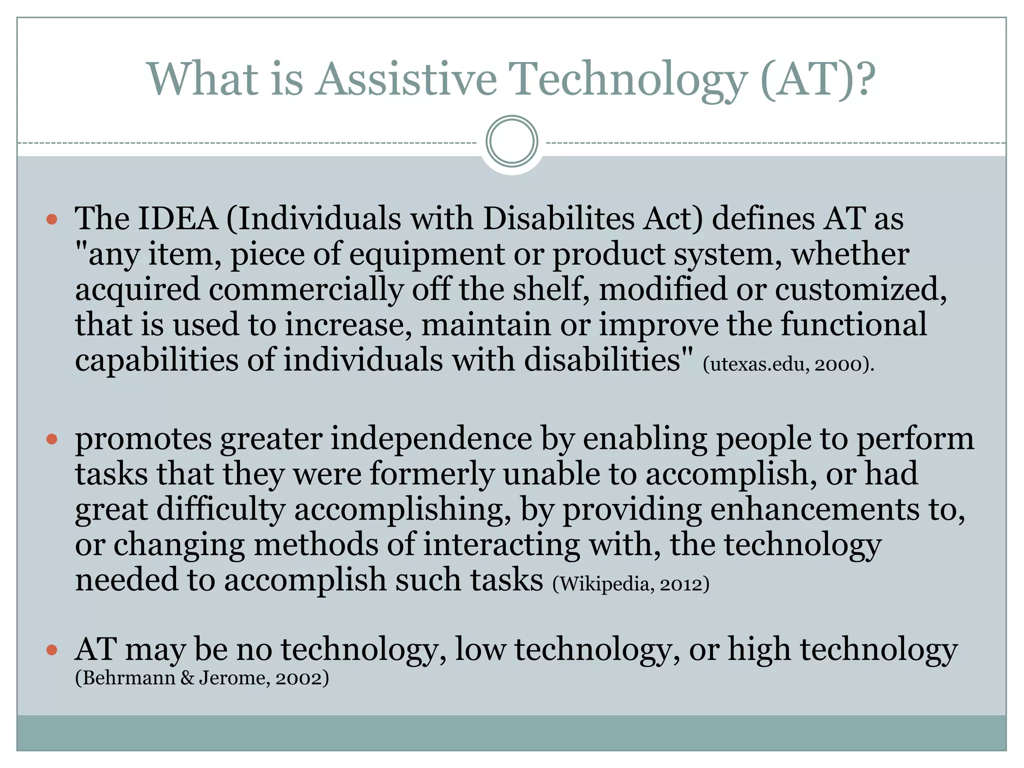 This document discusses assistive technology (AT) and its uses in education. [1] AT is defined as any item or equipment that helps individuals with disabilities increase their functional abilities. [2] AT can range from low-tech to high-tech solutions and is used across various subject areas and disabilities to help with tasks like organization, note-taking, writing, and accessing reference materials. [3] The document provides examples of AT for visual, hearing, and attention disabilities and discusses implementing AT through the individualized education plan process.