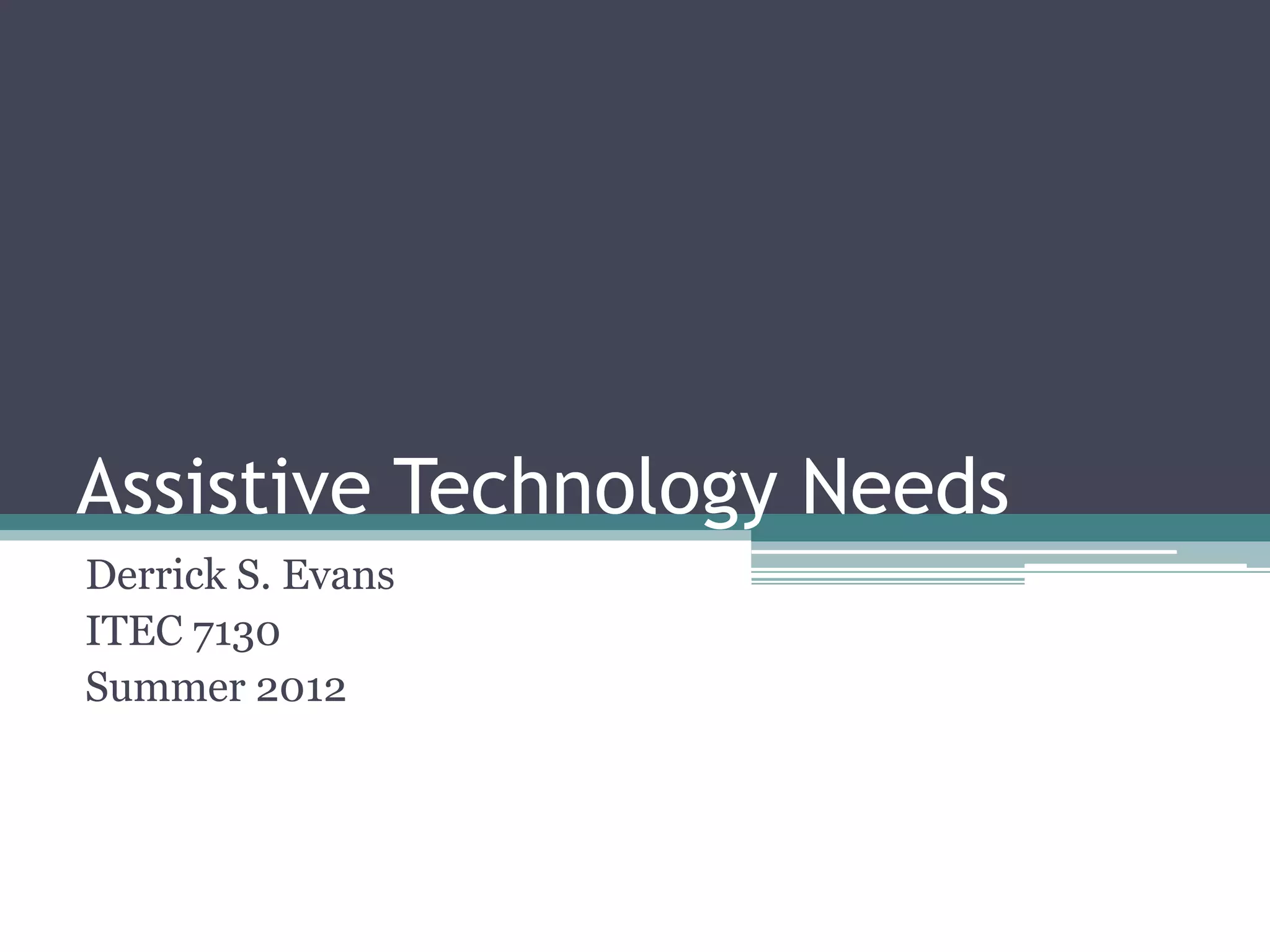 This presentation focuses on the need for assistive technology and other resources to support students with mild learning disabilities in reading, writing, auditory processing, and ADHD. It recommends using universal design for learning principles and Gardner's theory of multiple intelligences to incorporate flexible materials, teaching methods, and assessments. Specific assistive technologies are suggested to aid students with auditory disabilities, ADHD, and mild learning disabilities impacting reading and writing. Formative assessments and continual evaluation of instruction are also emphasized to meet the diverse needs of all students.