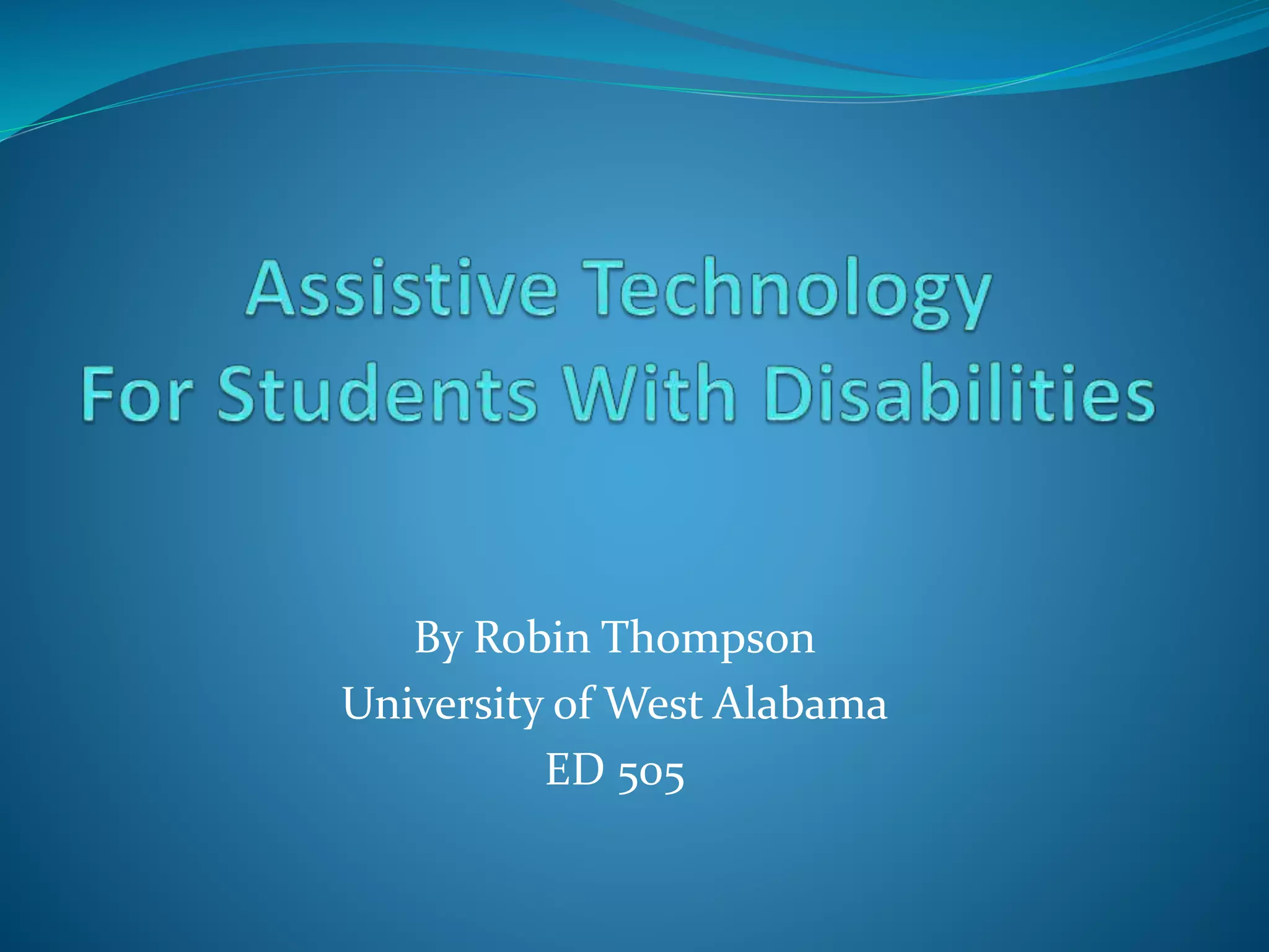 This document discusses assistive technology and its uses to help students with disabilities obtain an appropriate education. It defines assistive technology as devices or services that help individuals with disabilities. The document outlines that Section 504 and IDEA require schools to provide assistive technology to students with disabilities. It provides examples of assistive technology for students who are hearing impaired, visually impaired, learning disabled, or physically disabled. These include FM systems, screen magnifiers, optical character recognition, and adapted keyboards.