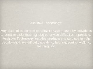 This document discusses assistive technology and examples that can help students with various disabilities. It defines assistive technology as equipment or software that helps people perform tasks that may otherwise be difficult. Laws like the ADA and IDEA require accommodating students with disabilities. Examples provided for hearing, visual, learning, and physical disabilities include hearing aids, screen readers, word processors, and switches operated by mouth/head. The assistive technologies aim to provide access to education for students with diverse needs.