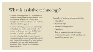 This document discusses assistive technology, which refers to tools that help students with disabilities complete tasks and leverage their strengths. Assistive technology includes highlighters, books on tape, inclined writing surfaces, and computer programs for text-to-speech or speech-to-text. Laws like the Technology Related Assistance for Individuals with Disabilities Act and Individuals with Disabilities Education Act require schools to provide assistive technologies. The document then describes examples of assistive technologies that help those with hearing, visual, learning, or physical impairments, such as VV-Talkers, tactile image enhancers, variable speed tape recorders, and Satalight SMART Boards.
