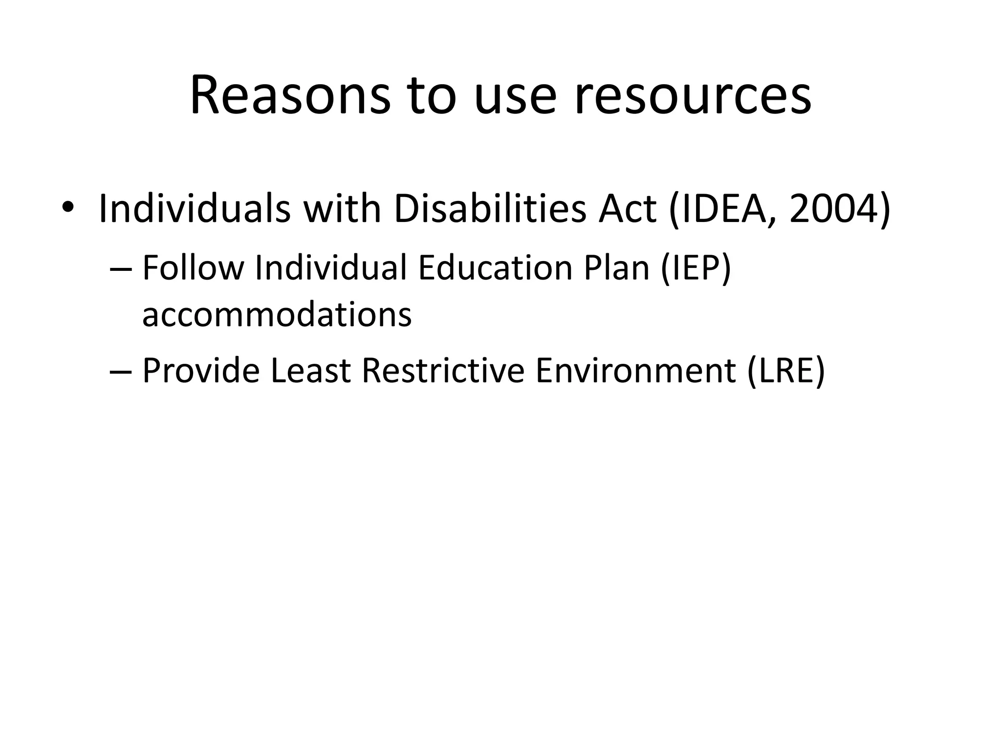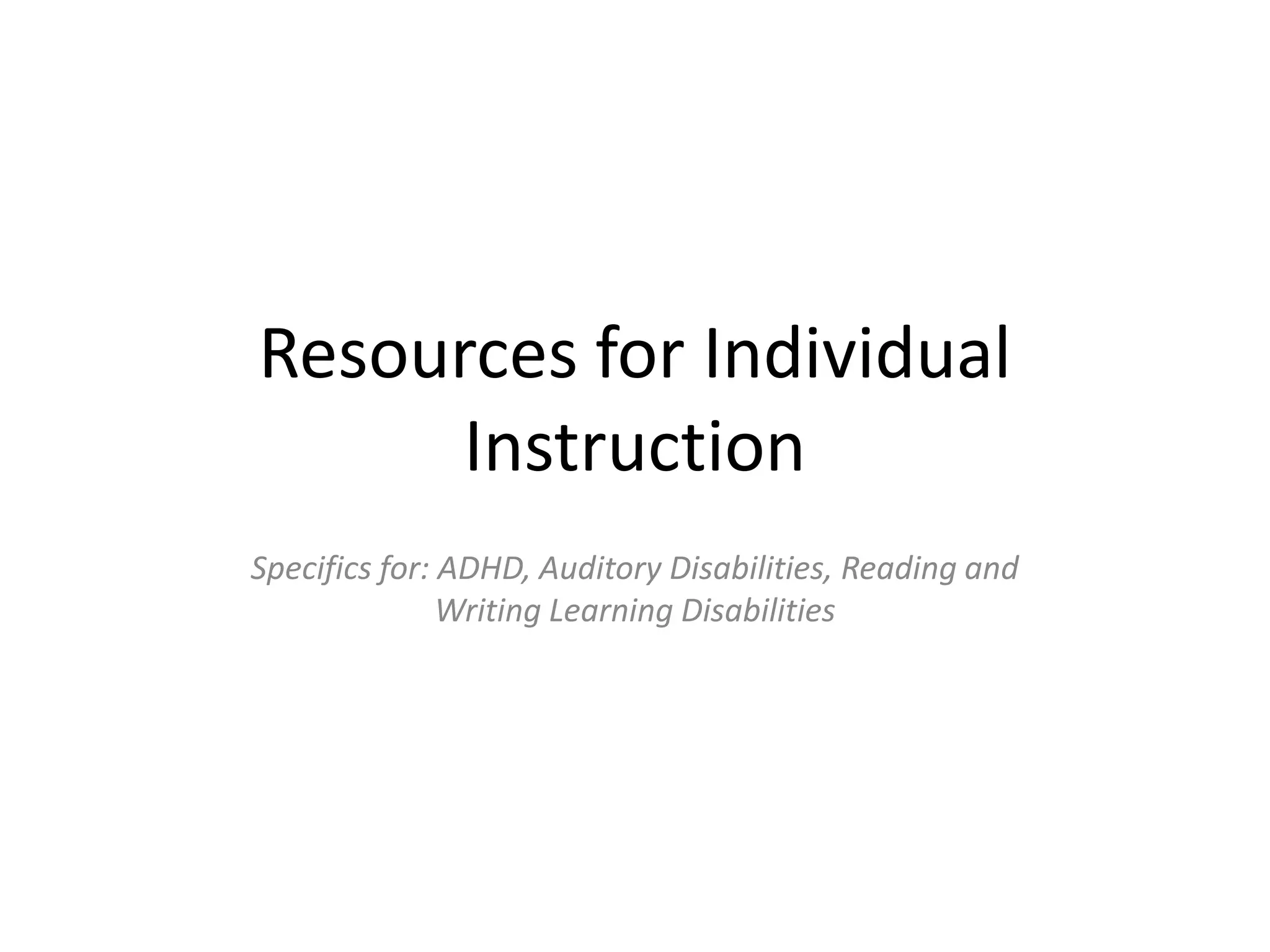 This document discusses resources for individual instruction for students with disabilities like ADHD, auditory disabilities, and reading/writing learning disabilities. It outlines the Individualized Education Plan process and guidelines for providing instruction in the Least Restrictive Environment. Support services like counseling and therapy are recommended before classroom accommodations. Classroom accommodations may include assistive technology support devices, specialized technology, modified assignments, and preferential seating. Special education paraprofessionals and co-teachers provide support within inclusion classrooms.