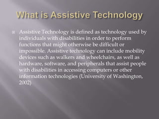 This document discusses assistive technology and strategies for helping students with special needs. It defines assistive technology as technology that assists individuals with disabilities to perform functions that may otherwise be difficult. It describes some common special needs like ADHD, autism, visual and hearing impairments. For students with ADHD, it recommends seating them near the teacher, using peer tutoring, and limiting distractions. It also provides strategies for helping students with auditory and mild learning disabilities through ensuring proper use of hearing devices, using visual aids, educational games, and adjusting teaching styles.
