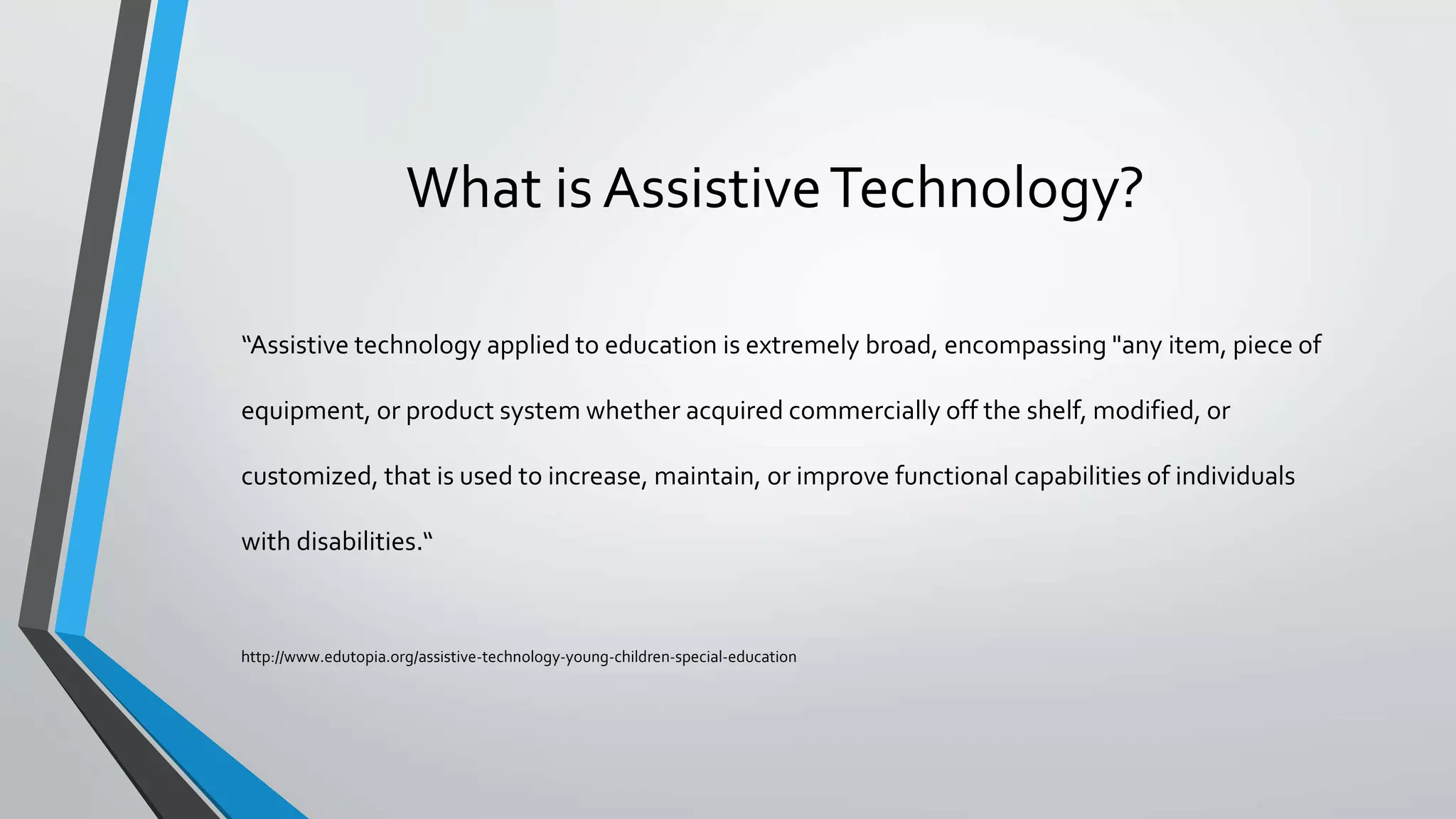 Assistive technology is any item, equipment, or product system that is used to increase, maintain, or improve the functional capabilities of individuals with disabilities. The Technology-Related Assistance for Individuals with Disabilities Act provides funding for assistive technology programs and services. Examples of assistive technology include hearing loop systems for the hearing impaired, optical character recognition and braille embossers for the visually impaired, text-to-speech software for students with dyslexia, and wheelchairs and walkers for individuals with physical disabilities.