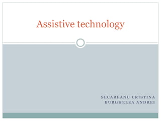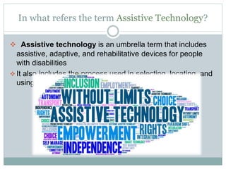 Assistive technology encompasses devices and processes that enhance the independence of individuals with disabilities, covering categories like mobility, visual, hearing, and cognitive impairments. It includes tools such as wheelchairs, screen readers, hearing aids, and memory aids that facilitate daily activities, education, and sports participation. The UN and WHO advocate for disability rights and inclusion, emphasizing the societal benefits of integrating assistive technologies and promoting equal opportunities.