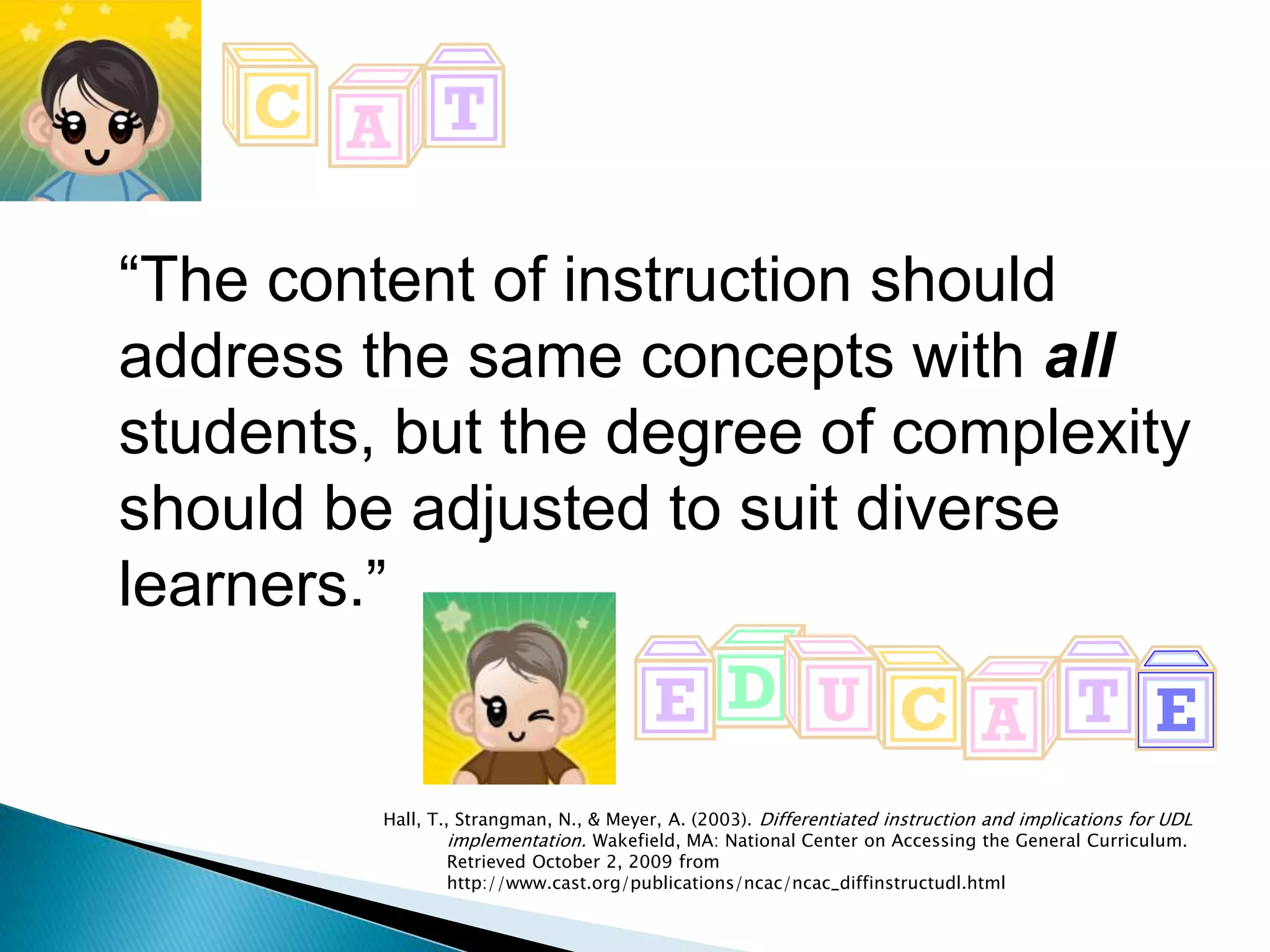 The document discusses differentiated instruction, noting that instruction should address core concepts for all students but adjust the complexity and degree of tasks according to individual learners' needs. It also provides examples of strategies like adjusting the complexity of assignments, using supplemental aids, and varying students' levels of participation. The goal is to tailor education to support the success of all students, regardless of their abilities or backgrounds.