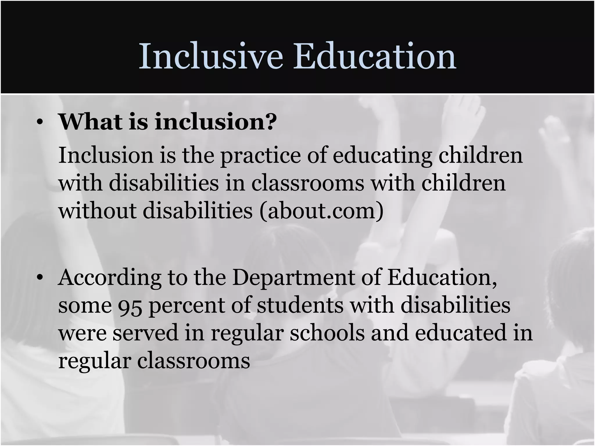 This document discusses assistive technology and its role in meeting the needs of diverse learners. It defines inclusion, the Individuals with Disabilities Education Act (IDEA), and the concept of the least restrictive environment. IDEA requires that students with disabilities receive a free and appropriate public education in the least restrictive setting possible through an Individualized Education Program (IEP). The IEP may incorporate assistive technology to help students achieve their academic goals. Assistive technology encompasses any item or piece of equipment that helps individuals with disabilities maintain or improve their functional abilities. It can range from low-tech to high-tech options and is categorized based on the type of support it provides, such as for mobility, instruction, communication,