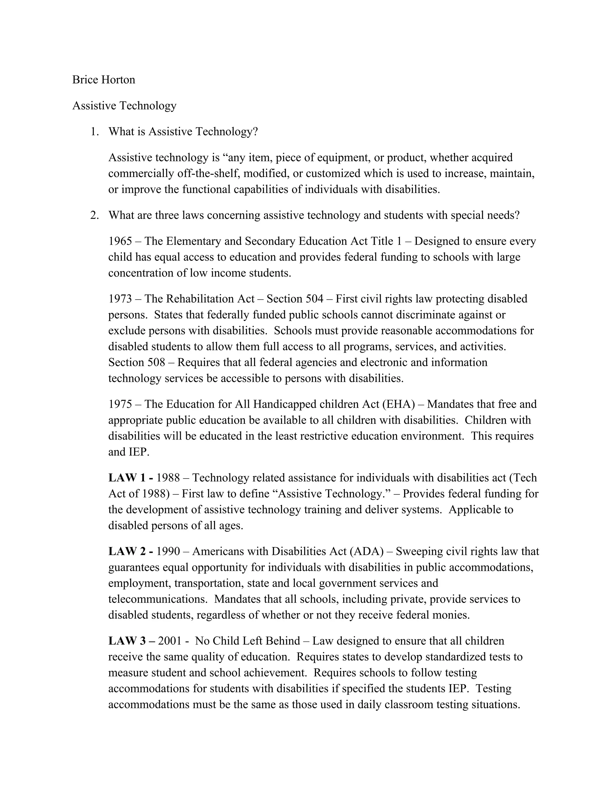 This document discusses assistive technology and laws concerning students with special needs. It defines assistive technology as any item or equipment that helps individuals with disabilities increase, maintain, or improve their functional abilities. It outlines four key laws - the Technology Related Assistance for Individuals with Disabilities Act of 1988, the Americans with Disabilities Act of 1990, the No Child Left Behind Act of 2001, and the Assistive Technology Act of 2004 - that guarantee students with disabilities have access to assistive technology. It also describes different categories of assistive technology and provides an example for each. Finally, it discusses how to determine students' assistive technology needs through the SETT process and IEP meetings.