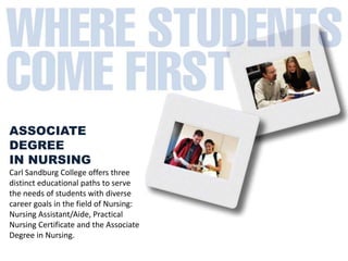 Carl Sandburg College offers a two-year Associate Degree in Nursing that prepares students to become registered nurses through a nationally accredited program. The curriculum includes clinical experience in various health care settings and equips graduates to take the NCLEX-RN for licensure. With high demand for nurses expected to increase due to an aging population, the program provides a supportive educational environment with numerous job opportunities.