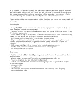As an Associate Executive Recruiter, you will generate new business leads, develop clients, and learn skills in candidate generation, time management, and relationship building. The role involves managing the full recruitment process from sourcing candidates to placement, conducting interviews to evaluate fit, and providing updates and support. Requirements include 2 years of sales or business development experience, a bachelor's degree, strong communication and computer skills, and the ability to source, qualify, present, and follow up with candidates.