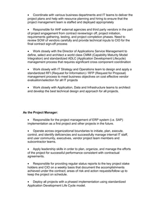 This job posting is for an Associate IT Director of Process & Project Management. The position is responsible for managing IT projects through their entire lifecycle using a standardized methodology. Key responsibilities include overseeing implementation of systems like SAP, managing a program management office, ensuring projects are completed on time and budget, and mentoring a project management team. A Bachelor's degree, 10 years of IT experience including 5 years in project management, PMP certification, and experience managing large implementation projects are required.