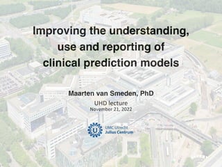This document contains a summary of a lecture on improving the understanding, use, and reporting of clinical prediction models. It discusses the large number of existing clinical prediction models, issues with how many models are reported, and methods research around topics like validation and performance metrics. It also covers the increasing use of artificial intelligence and machine learning in clinical prediction models and challenges like adversarial examples.