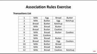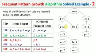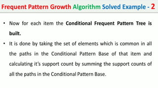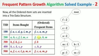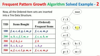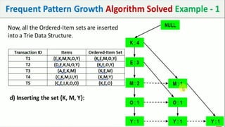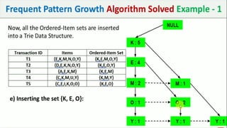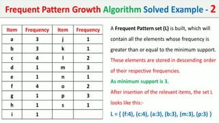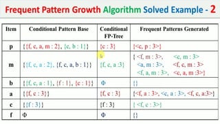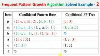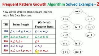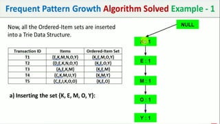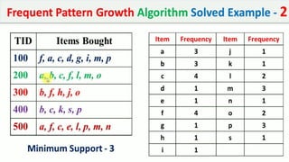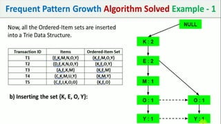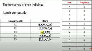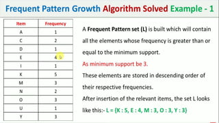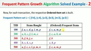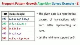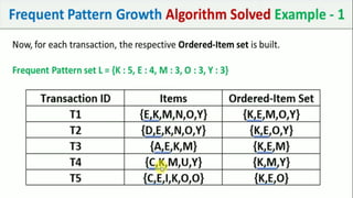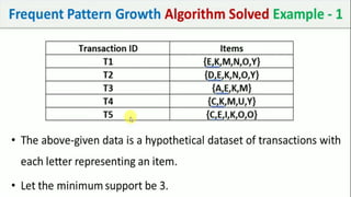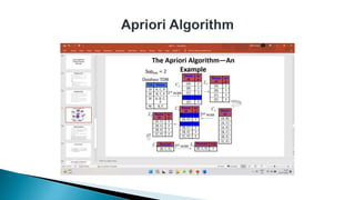 The document discusses data mining, particularly focusing on the process of knowledge discovery, including preprocessing, data mining, and postprocessing. It highlights frequent itemset mining techniques such as the Apriori and FP-Growth algorithms, explaining their functionality, advantages, and applications in various fields like market basket analysis and fraud detection. Additionally, it delineates the concepts of association rules, support, and confidence, emphasizing their significance in understanding relationships among items in datasets.
