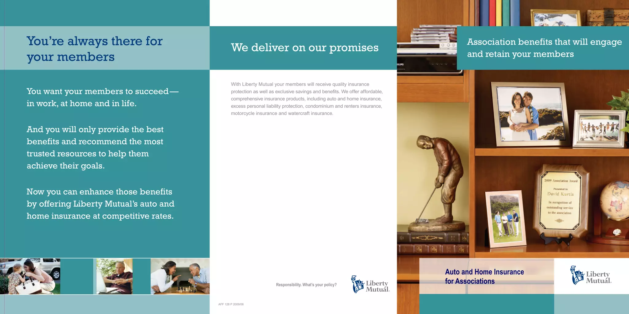 Liberty Mutual offers auto and home insurance to members of associations through a partnership program. As a partner, the association will be assigned an account team led by a dedicated Account Manager. The Account Manager will work with the association to develop a communications plan to engage members. Liberty Mutual has over 30 years of experience in the affinity insurance market and insures over 11,000 groups. Members will receive competitive rates on comprehensive insurance policies and have access to claims and customer service support.