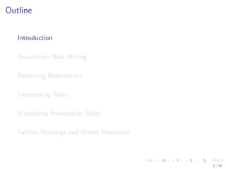 The document discusses association rule mining with R. It provides an overview of association rule mining concepts like support, confidence and lift. It then demonstrates how to use the apriori() function in R to generate association rules from the Titanic dataset. The document shows how to remove redundant rules, interpret rules and visualize rules using scatter plots and matrices.