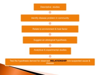 The document discusses the identification and testing of disease causality through various types of studies, emphasizing the importance of establishing associations and distinguishing between different types of relationships (causal, indirect, and spurious). It outlines key criteria for establishing causal relationships, such as temporality, strength of association, and biological plausibility, and discusses the implications for clinical practice in prevention, diagnosis, and treatment. The document emphasizes the need for rigorous methods and comparisons to affirm causative links in epidemiology.