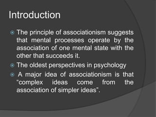 Associationism is one of the oldest perspectives in psychology that suggests mental processes operate through the association of mental states. A major idea of associationism is that complex ideas form from the association of simpler ideas. The British empiricists like Hobbes, Locke, Berkeley, and Hume used associationistic principles to explain mental activity. Hume differentiated impressions and ideas and proposed three laws of association: resemblance, contiguity, and cause and effect. Associationism influenced many learning theories and continues to be relevant today.