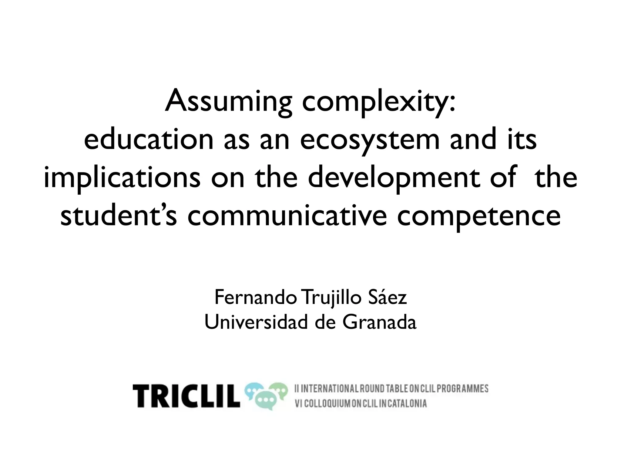This document discusses education as a complex ecosystem and the implications for developing student communicative competence. It argues that education is an unresolved practice that requires continuous work and movement. The school is viewed as a living ecosystem where education involves performance. CLIL is presented as a new consolidated object and language that motivates many teachers when implemented effectively by focusing on achievement, recognition, responsibility and growth. Key skills are developed through tasks and integrated projects involving cooperation, digital literacy, research projects, gaming, entrepreneurship, and service learning. Universities can support these efforts by providing open educational resources and cooperation.