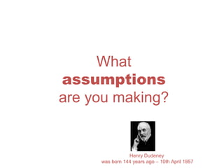 The document discusses solving a puzzle to connect nine points with no more than four straight lines without lifting your writing instrument. It provides tips to not make assumptions, such as that the lines must pass through dot centers, be thin, or stay within the paper edges. Non-traditional solutions are suggested like ripping or creasing the paper to connect all nine points with fewer than four lines.