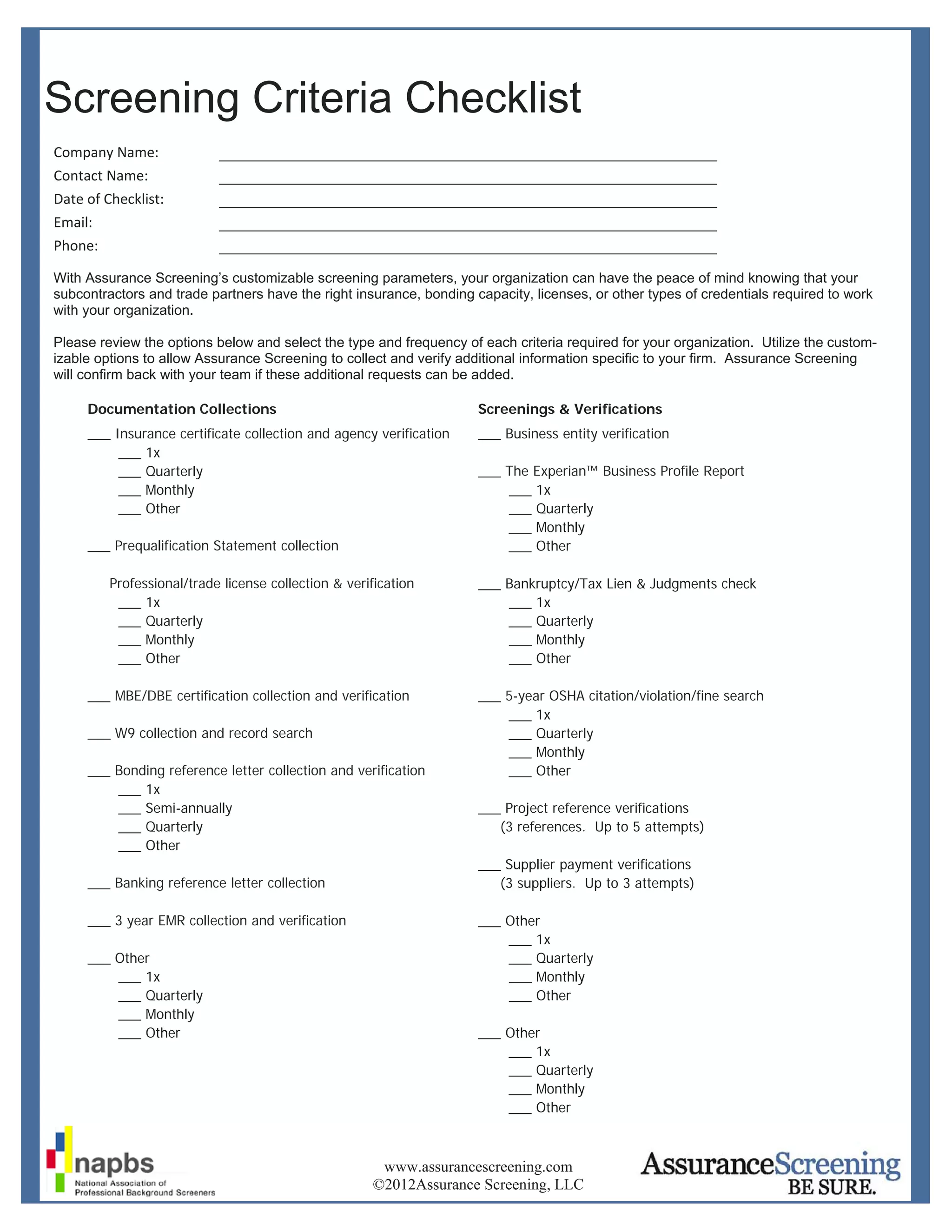 The document is a screening criteria checklist from Assurance Screening that allows companies to select verification and documentation requirements for subcontractors and trade partners. It includes options to collect and verify insurance certificates, licenses, financial documents, safety records, references, and other credentials on various frequencies to ensure partners meet the company's standards. Assurance Screening can customize the criteria and confirm if additional requests can be added.