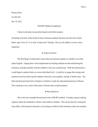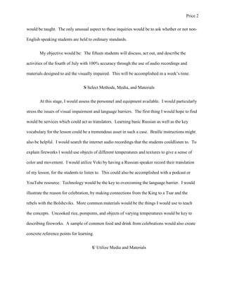 1) The document outlines a lesson plan for teaching 15 Russian students ages 10-19 about the Fourth of July. The students have varying levels of vision impairment and do not speak English.