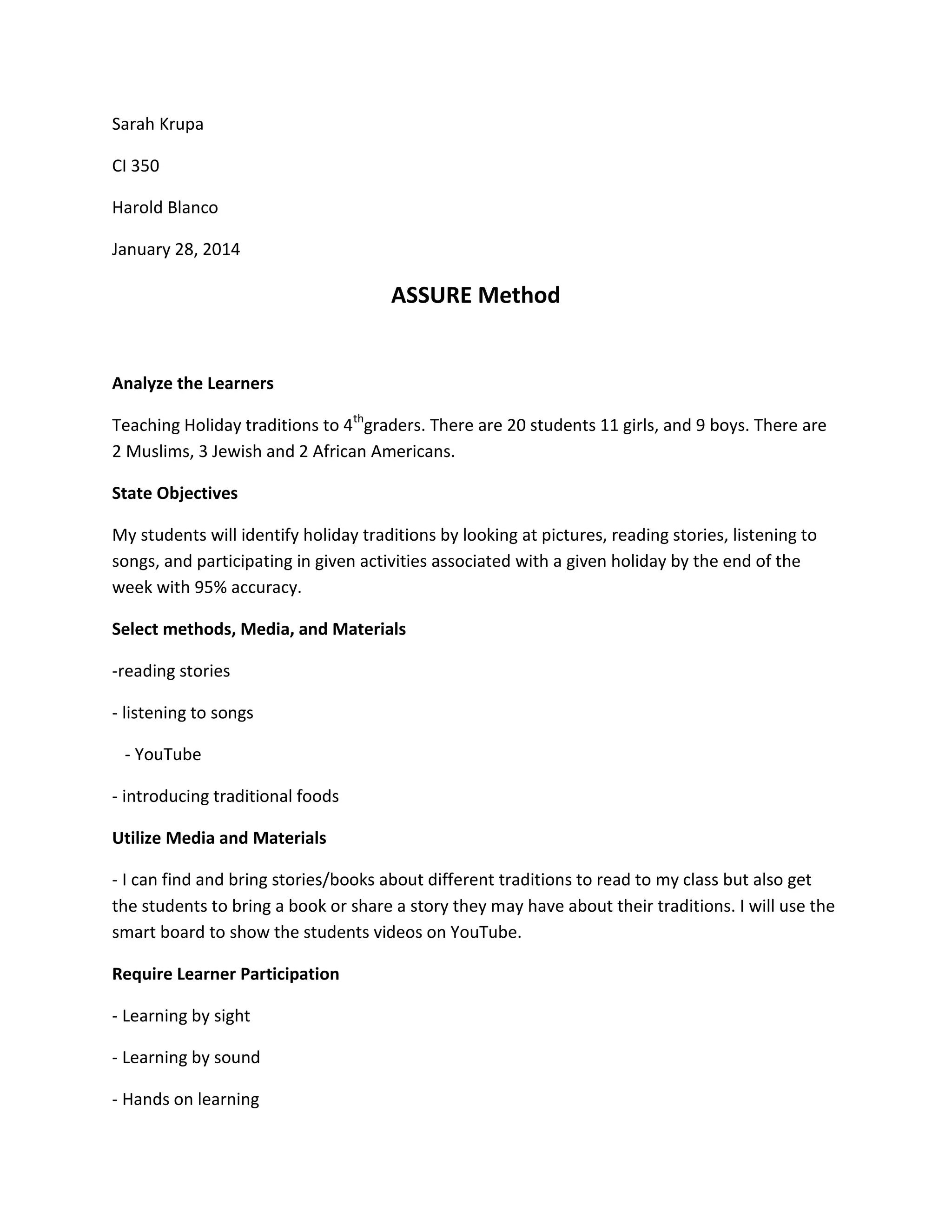 This document outlines an ASSURE method lesson plan for teaching 4th grade students about holiday traditions. The plan analyzes the diverse class of 20 students and states the objective of having 95% of students identify holiday traditions through pictures, stories, songs, and activities. A variety of methods like reading, listening to songs, YouTube videos, and traditional foods will be used. Students will participate through visual, auditory, and hands-on learning. Their understanding will be evaluated through a presentation on a holiday tradition not their own.
