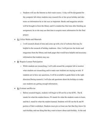 Students will research holiday traditions from different cultures that they do not normally celebrate. The unit will involve 4th grade students researching holidays online and using books to learn about traditions of Christmas, Kwanza, Hanukkah, and Ramadan. Students will present what they learned to the class through a creative project. The teacher will monitor students during research and ensure they understand the material to be presented with 90% accuracy.