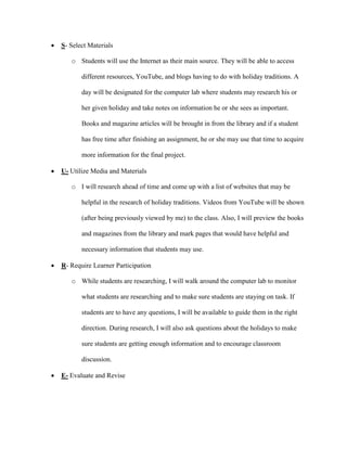 The document outlines an ASSURE lesson plan for a 4th grade class. It involves having students research and present on holiday traditions from religions other than their own. The 20 students in the class come from various religious backgrounds. The objectives are for students to describe holiday traditions of Christmas, Kwanza, Hanukkah, and Ramadan with 90% accuracy. Students will use the internet, books, and magazines during a designated computer lab period to research a holiday assigned to them. The teacher will provide curated websites and materials to guide students' research and presentations. Students will be monitored during research and asked questions to encourage discussion. They will fill out a KWL chart to track their initial knowledge and new learning.