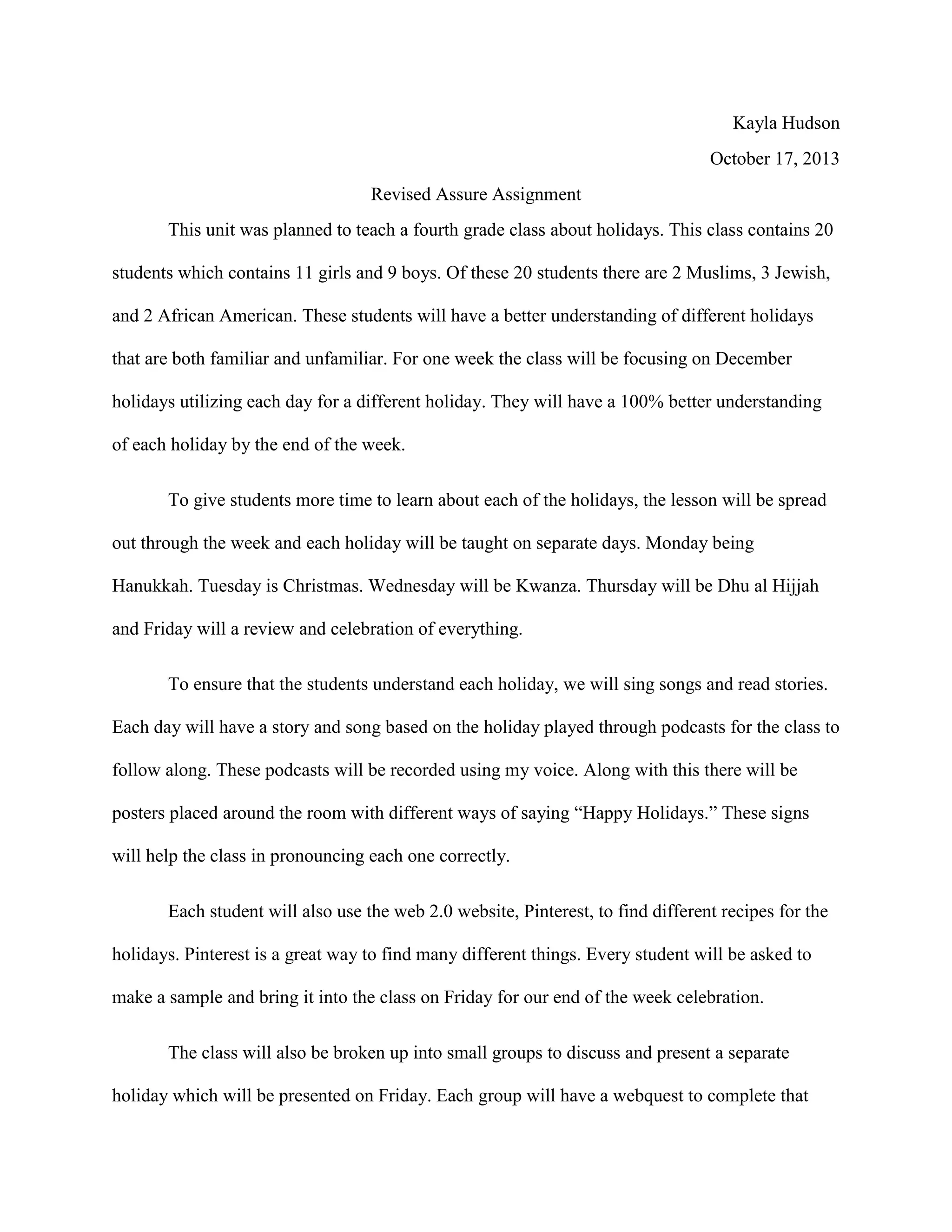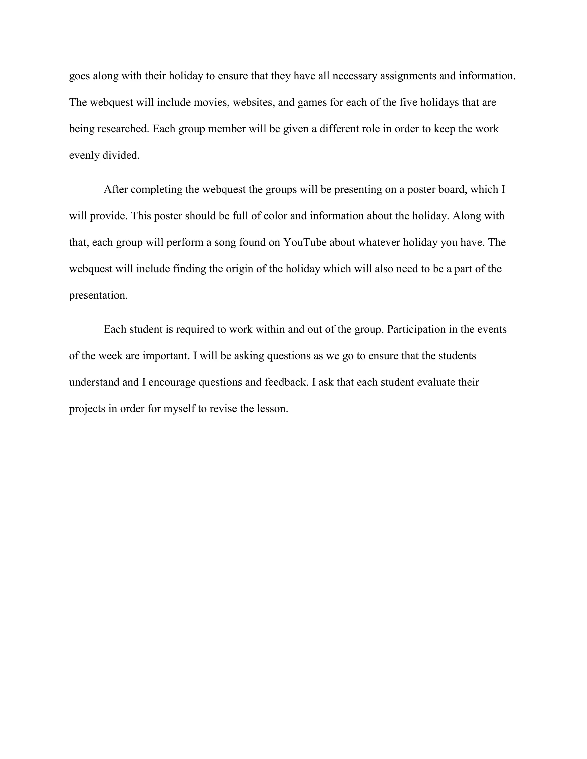 This unit plan teaches a fourth grade class about various winter holidays through a week-long lesson. The class has 20 students from various religious backgrounds. Each day of the week focuses on a different holiday: Monday is Hanukkah, Tuesday is Christmas, Wednesday is Kwanzaa, Thursday is Dhu al Hijjah, and Friday is a review. Students will learn about the holidays through stories, songs, posters, recipes shared on Pinterest, and group presentations with a webquest for research. On Friday, students will share their holiday recipes and groups will present posters and songs about assigned holidays.
