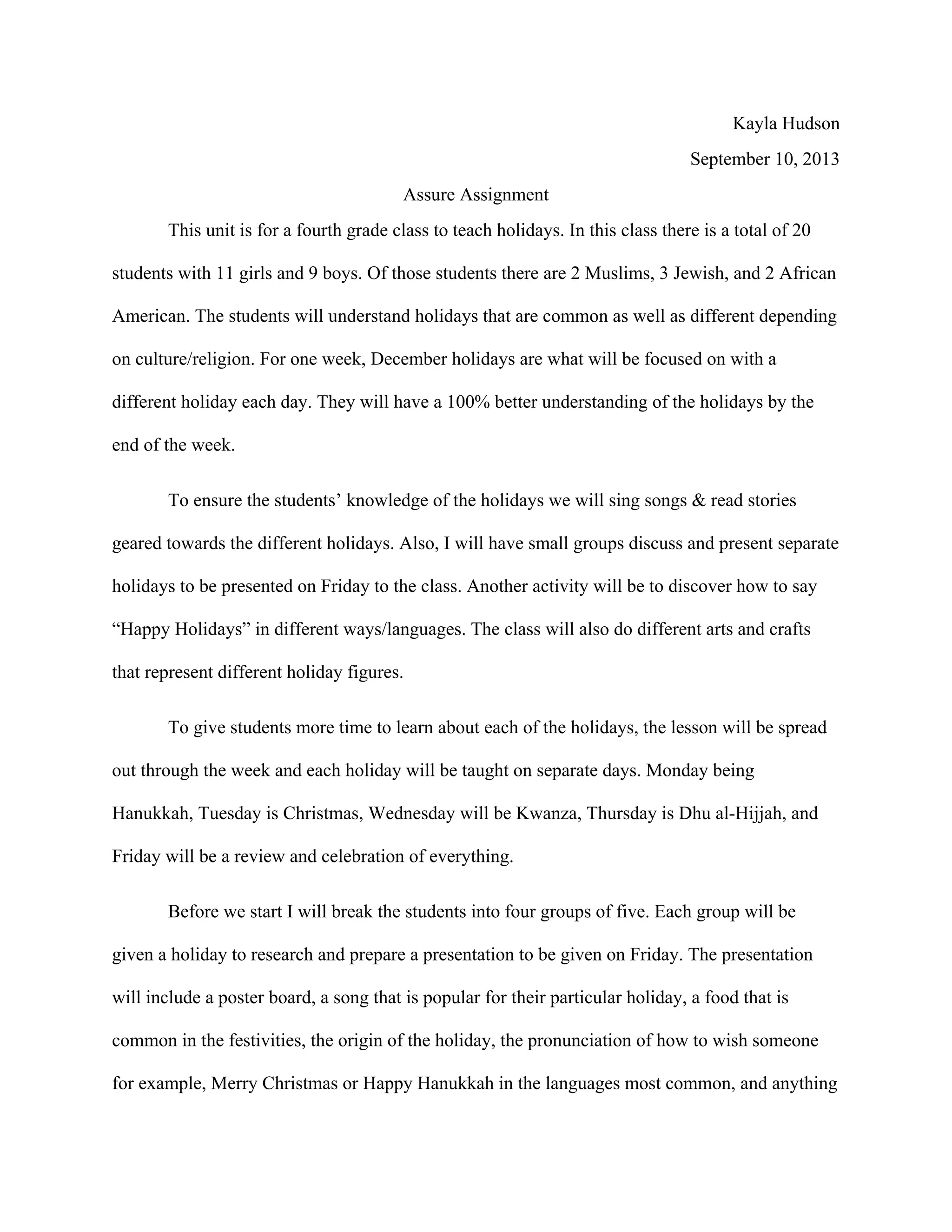 This unit is for a fourth grade class to teach about holidays from different cultures and religions. There are 20 students, with 11 girls and 9 boys, including 2 Muslims, 3 Jewish, and 2 African American students. The unit will focus on December holidays over the course of a week, with a different holiday taught each day - Hanukkah on Monday, Christmas on Tuesday, Kwanza on Wednesday, Dhu al-Hijjah on Thursday, and a review on Friday. Students will be split into groups to research and present a holiday to the class on Friday, including a poster, song, food, origin, and greetings in other languages. Arts and crafts and a final celebration are also planned.