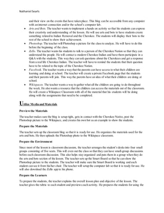 This document provides details about a lesson plan for 10th grade students learning about Native Americans. It includes information about the students, objectives, methods, and assessments. Specifically, it notes that the lesson involves classroom discussions, analyzing a photo, speaking to a Cherokee Indian via phone, writing blogs, and creating arts and crafts robots in small groups. The teacher sets up various technologies and materials to facilitate the activities and assessments.