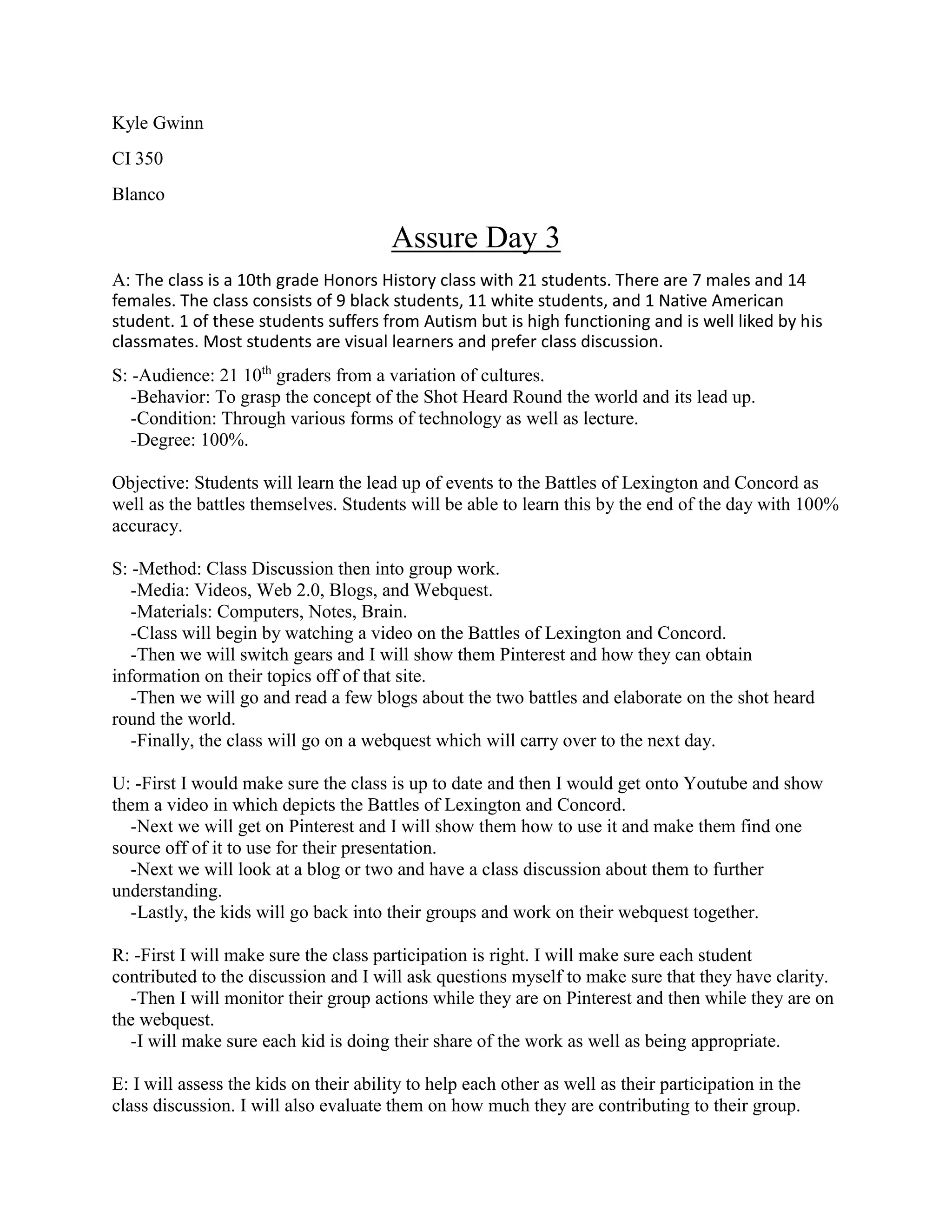 The class consists of 21 10th grade students from various backgrounds. The objective is for students to learn about the lead up to and battles of Lexington and Concord with 100% accuracy through a variety of activities. The lesson plan includes watching a video on the battles, using Pinterest to find sources, reading blogs and having a class discussion, and completing a webquest in groups. The teacher will monitor participation, group work, and contributions to ensure understanding and evaluate students on their collaboration and discussion participation.