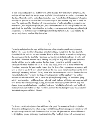 The document summarizes a lesson plan for a 3rd grade class about literary elements. It will focus on plot over the course of a week through class discussions, read-alouds, videos, and online activities. Students will learn about plot by reviewing an elements poster, reading a book, completing a worksheet in groups, and posting a book choice for a read-aloud online. The teacher will use various media like an elements poster, read-aloud book, and instructional video. Equipment like computers and an Elmo projector will need to be prepared. Students will be engaged through discussions, group work, and an online homework assignment requiring participation. The teacher will evaluate the lesson based on student understanding and feedback on what
