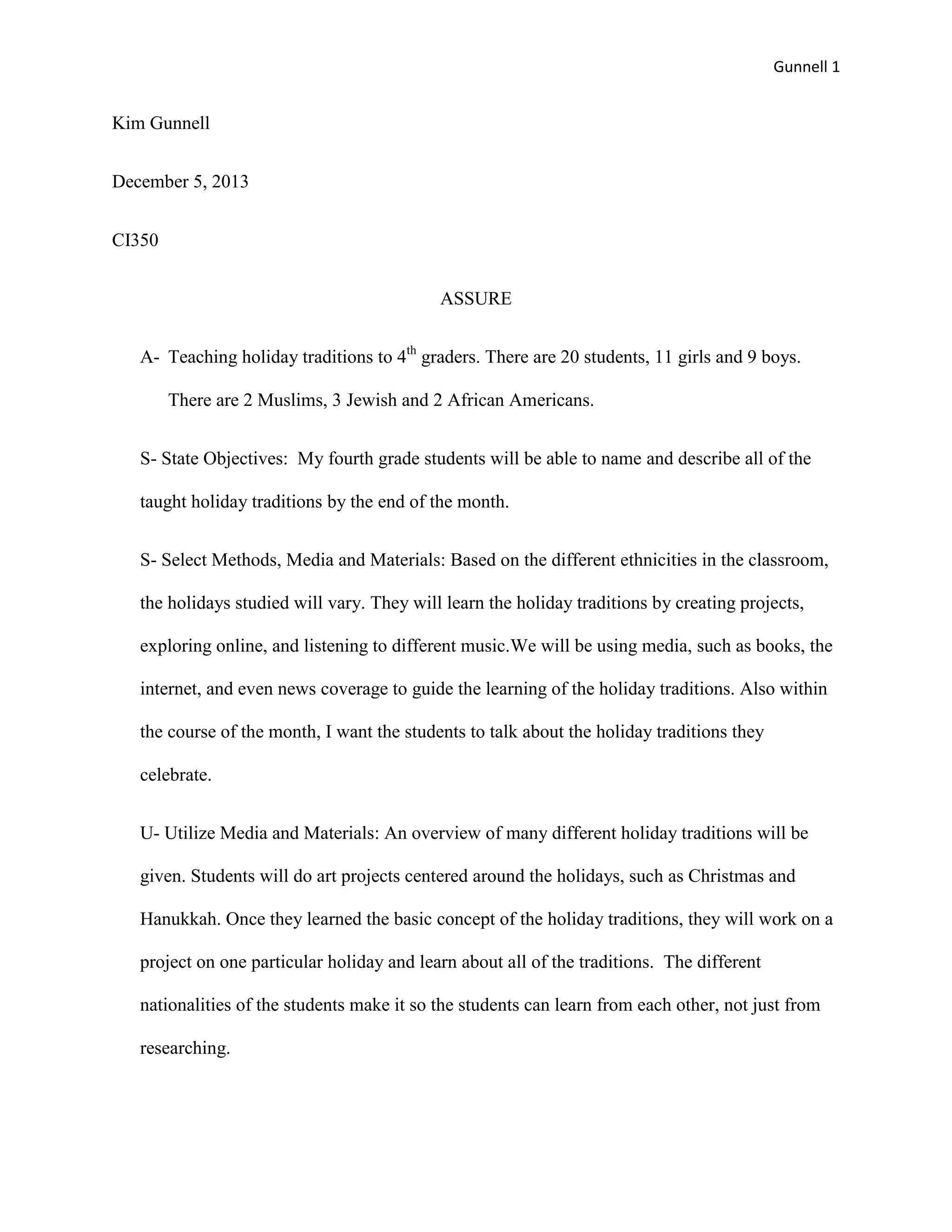 This document outlines a lesson plan for teaching 4th grade students about various holiday traditions. The class has 20 students from diverse backgrounds, including Muslims, Jews, and African Americans. The objectives are for students to name and describe the taught holiday traditions by the end of the month. Various methods will be used, including creating projects, online exploration, listening to music, and having students discuss their own traditions. Students will give presentations on the traditions of one holiday and learn about others from their classmates. Evaluation will be based on student presentations and written work, allowing the teacher to assess learning and make adjustments to teaching methods.