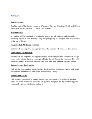 The teacher planned to teach 20 4th grade students about the digestive system. There were 10 girls and 10 boys, with 8 African American students, 2 Chinese students, and 10 white students. The objectives were for students to learn the main parts of the digestive system and recite them with 95% accuracy after discussing a poster, learning a song, and completing a webquest. Students would use computers and paper to do a webquest and learn from a digestive system poster and YouTube video. The teacher would evaluate students by checking their participation and asking questions about the digestive system content.