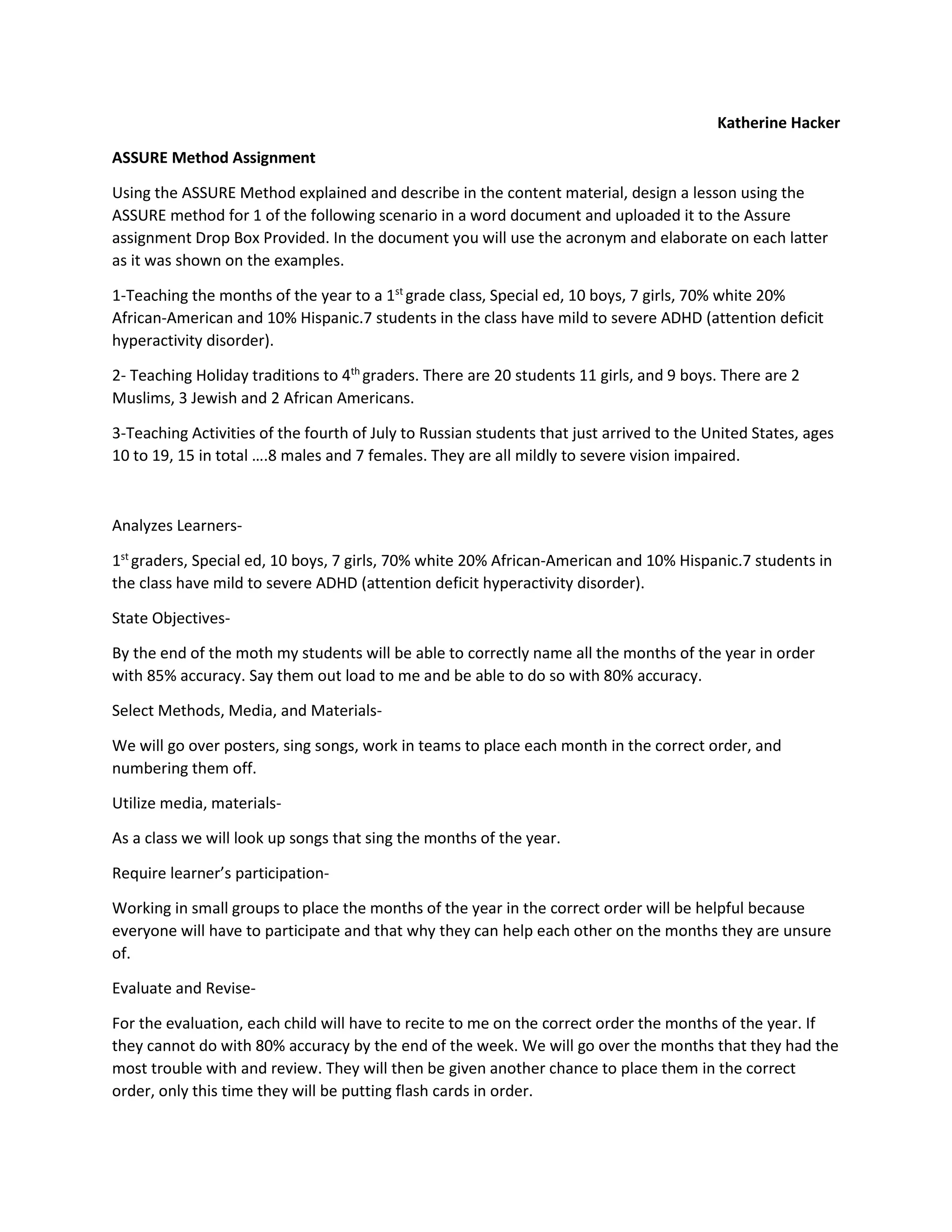 The document outlines a lesson plan for teaching first grade students the months of the year using the ASSURE method. The students are in a special education class with 10 boys and 7 girls from various racial backgrounds, and 7 have ADHD. The objectives are for students to name the months in order with 85% accuracy and say them aloud with 80% accuracy. Methods will include using posters, singing songs, working in teams to order months, and numbering them off. Materials will include songs about the months. Learners will participate by ordering months in groups. Evaluation will be individual recitation of the months, and reteaching will focus on trouble areas before retesting with flashcards.