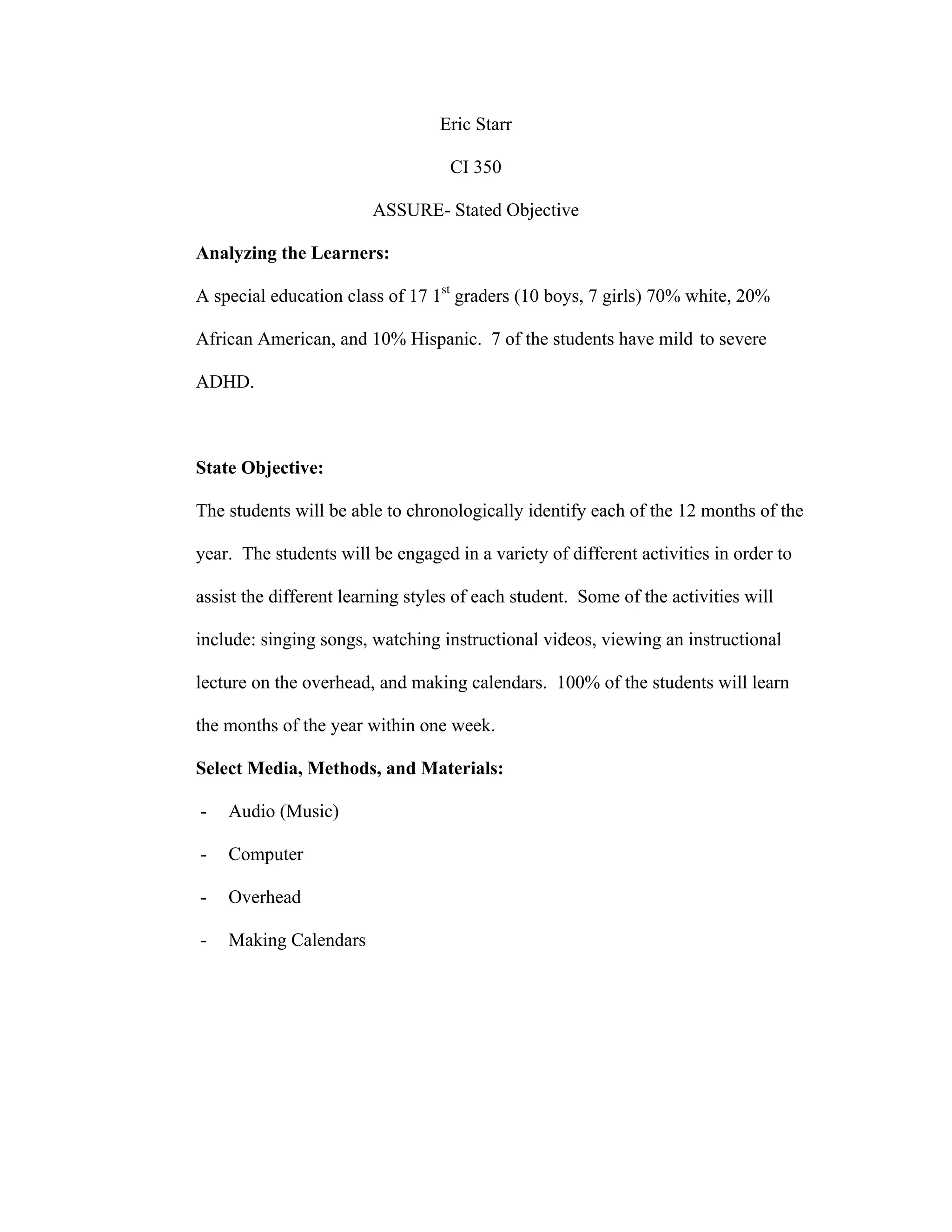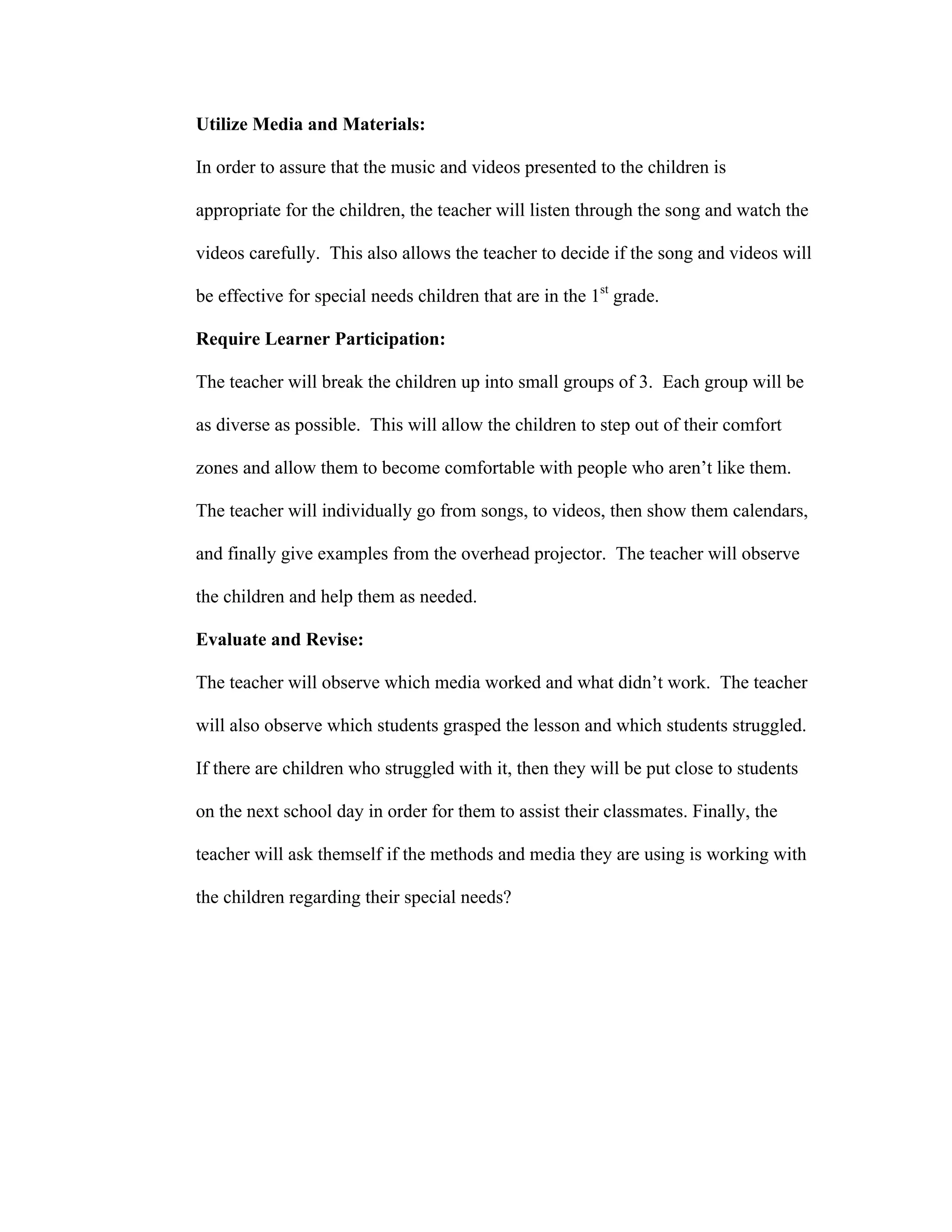 The document outlines a lesson plan for teaching 1st grade students the months of the year. The class has 17 students, most of whom are white, with some African American and Hispanic students. Several have ADHD. The objective is for all students to learn the months of the year within a week using different activities tailored to various learning styles, including songs, videos, lectures and making calendars. The teacher will carefully select age-appropriate media and break students into diverse small groups. They will observe each student's understanding and provide extra help as needed, revising the lesson as appropriate.