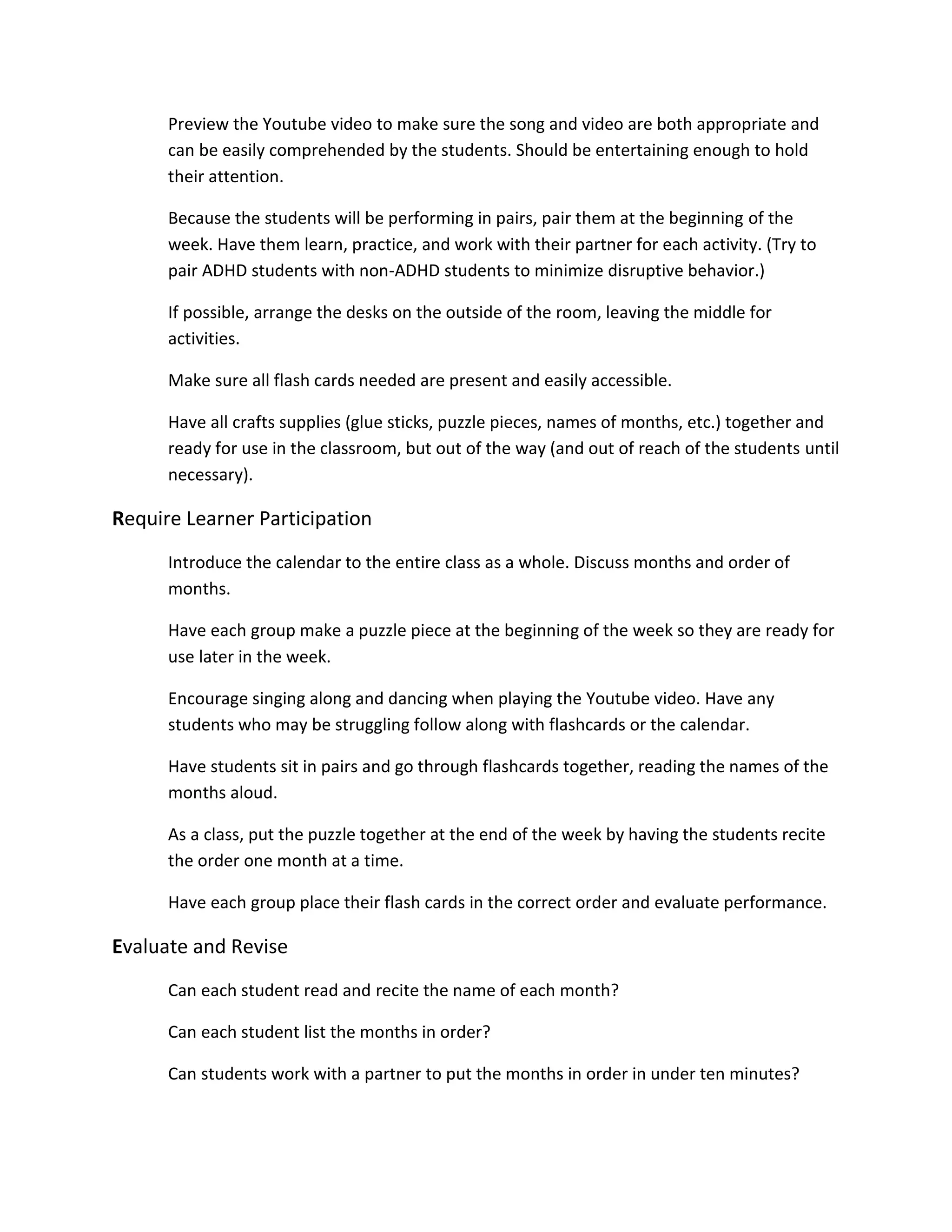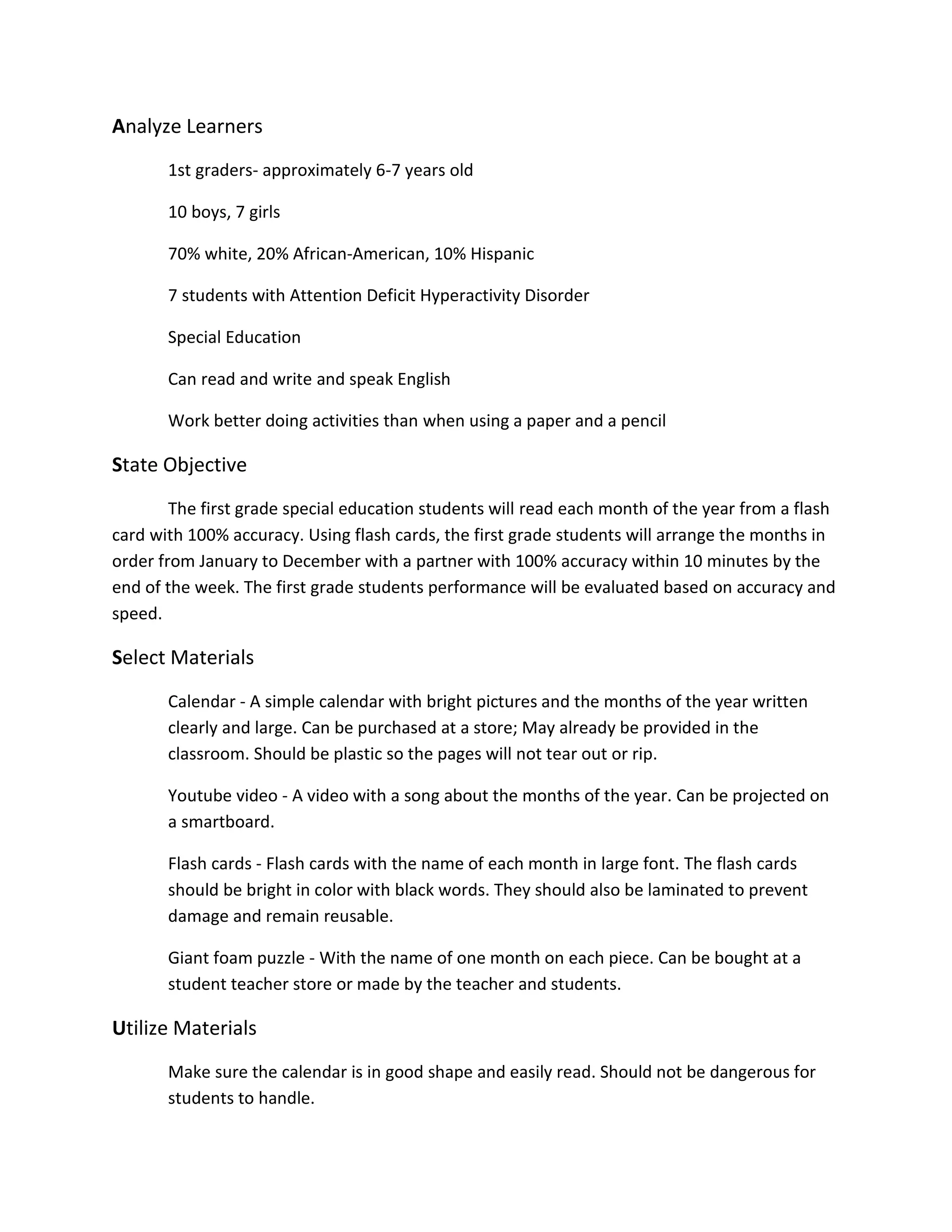 This document analyzes a class of 1st grade special education students and outlines a plan to teach them the months of the year. The class has 17 students who are mostly white or African American. Several students have ADHD. The plan is to use flashcards, a calendar, a puzzle, and a YouTube video to teach the students to read and order the months with 100% accuracy. Materials are selected, such as laminated flashcards and a plastic calendar. The teacher will introduce the calendar, have students make puzzle pieces, play the video, work in pairs with flashcards, and put the puzzle together to evaluate learning. Performance will be evaluated on reading, ordering, and speed to determine if revisions are needed.
