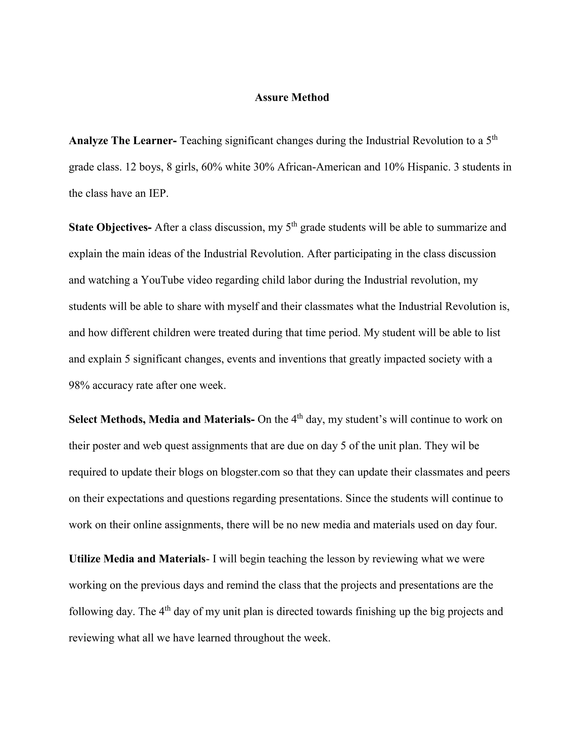 This document outlines a 5-day unit plan for teaching a 5th grade class about the Industrial Revolution. The class has 20 students, including 3 with IEPs. On day 4, students will continue working in groups on poster and web quest assignments that are due the following day. They will update blogs to share their progress and questions with peers. The teacher will review what they have learned and remind students of upcoming due dates, while walking around to answer questions. All students must participate in finishing group projects for the day's activities.