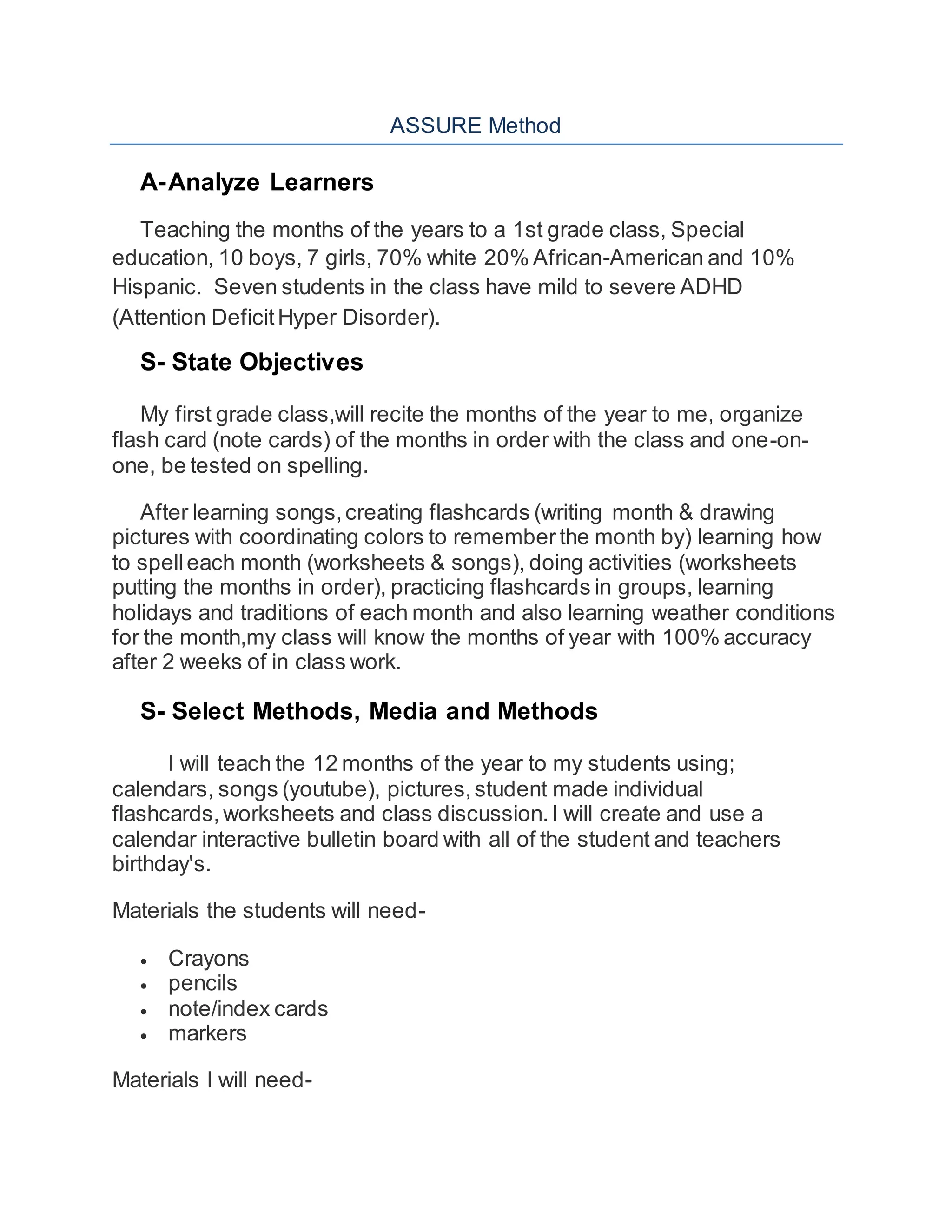 The document outlines the ASSURE method for teaching students the 12 months of the year. It will analyze the 1st grade class of 17 students, which is 70% white, 20% African American, and 10% Hispanic. Seven students have ADHD. The objectives are for students to recite and spell the months, and organize flashcards of the months in order. The teacher will use calendars, songs, pictures, flashcards, worksheets and discussion to engage students over 2 weeks. Students will participate by discussing months, singing, and being responsible for their own flashcards. The teacher will evaluate students through worksheets, flashcard exercises at their desk, and a spelling test at the end.