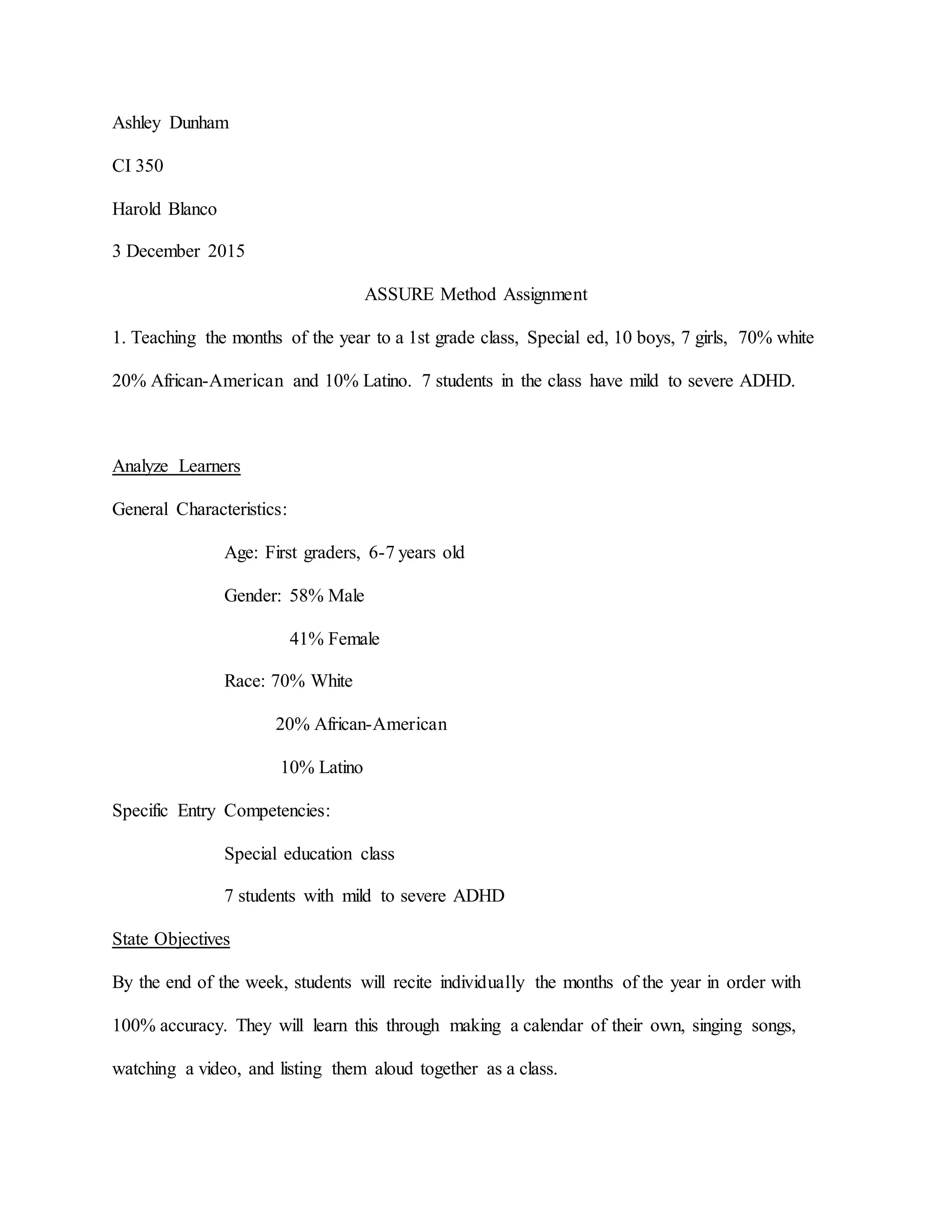 1) The document describes using the ASSURE method to teach 1st grade students, including those with ADHD, the months of the year. It will analyze the learners, set the objective of reciting the months in order with 100% accuracy, and select methods like making calendars, singing songs, and watching videos.