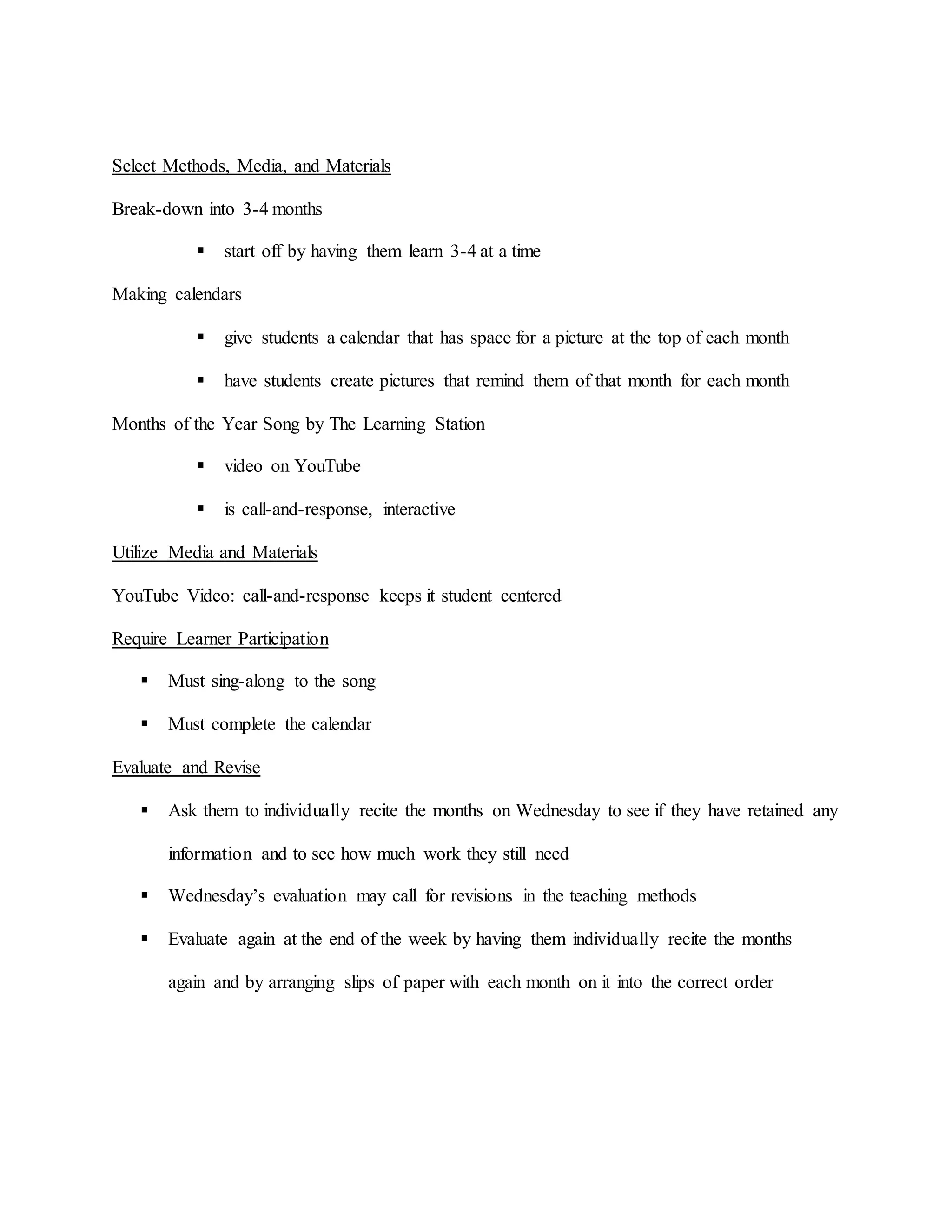 3) Students will be evaluated mid-week and at the end of the week to check their progress in reciting the months and to determine if any revisions are needed to the teaching methods.