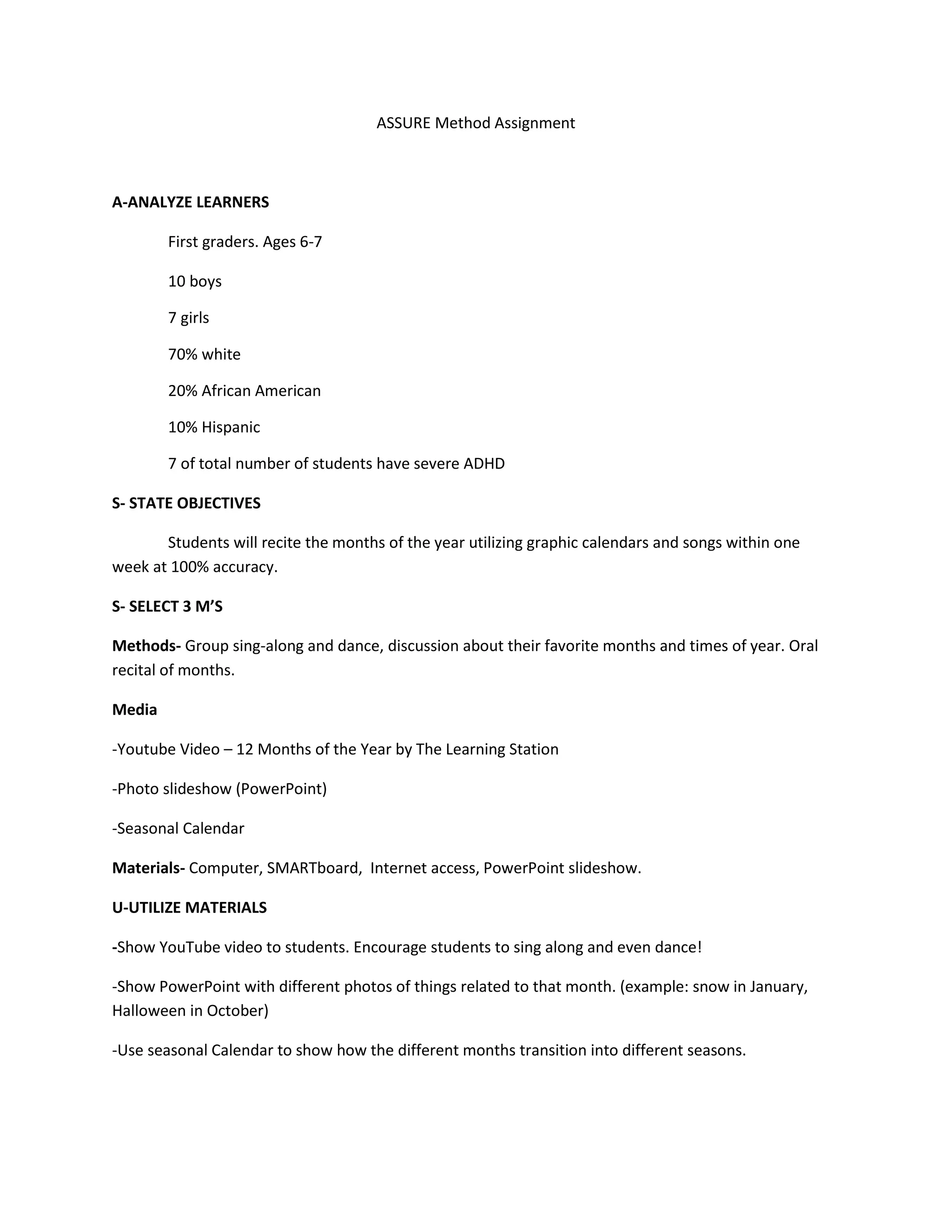This ASSURE method assignment aims to teach first grade students the months of the year over the course of one week. The students will utilize group activities like singing, dancing, and discussing their favorite months. They will watch a YouTube video and photo slideshow about the months. Students will be encouraged to participate in discussions and recitations of the months. Their progress will be evaluated through continuous observation, group work, and individual recitation to ensure they learn the months with 100% accuracy by the end of the week.