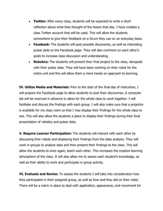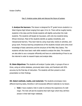 This lesson plan is designed for a 9th grade honors class in West Virginia to analyze pulsar plots over 5 days of instruction. The students will work in groups of 2-3 to analyze pulsar plots from an online database using previously taken notes. They will then present their findings on Facebook and discuss each other's posts. On the final day, students will present their findings alongside robotics projects they have been building. The teacher will facilitate discussion and ensure technology is available for presentations. Students will be assessed based on group participation, robot applications and their engagement on social media forums throughout the unit. Feedback will be used to revise and improve the lesson plan.