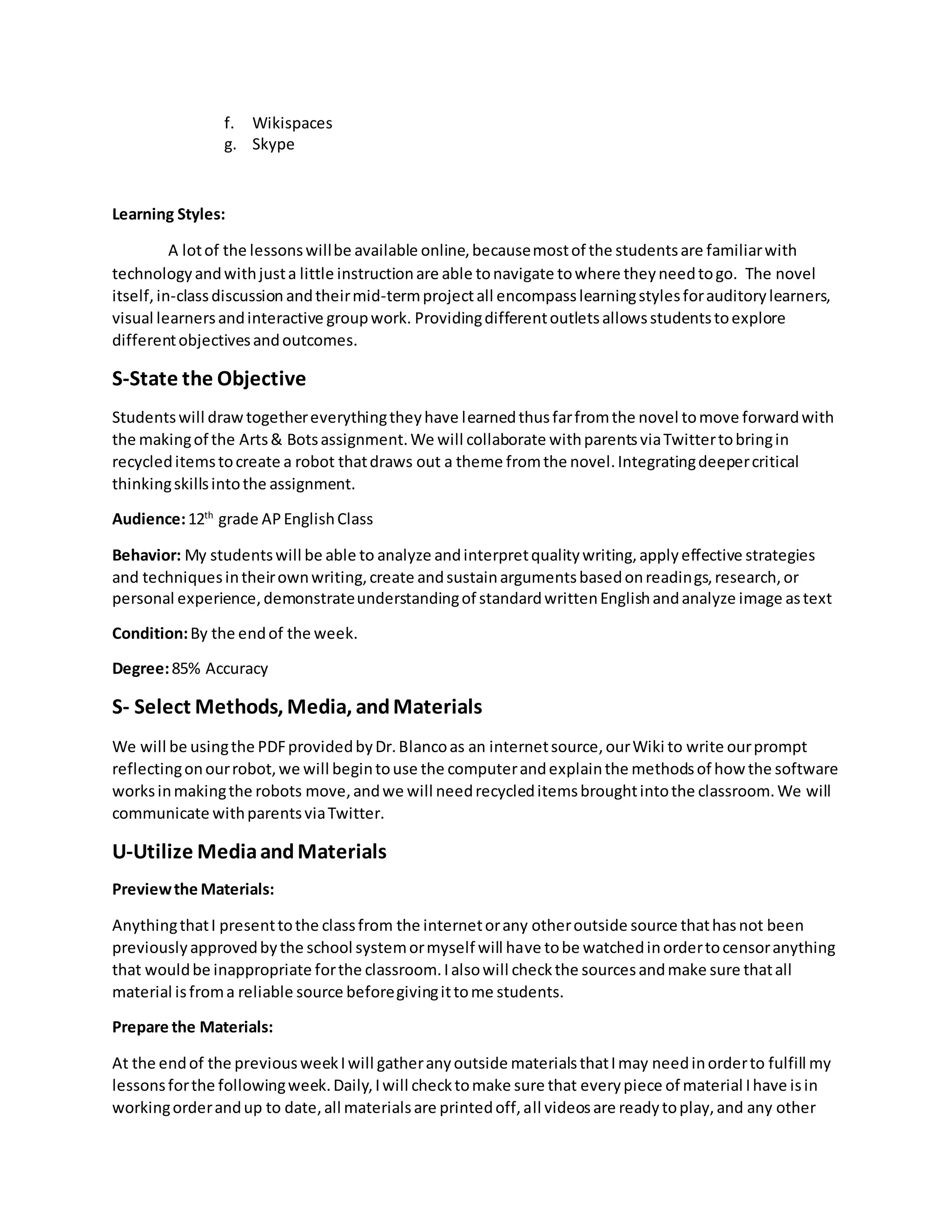 This document outlines a lesson plan for teaching Suzanne Collins' book Mockingjay to a 12th grade Advanced Placement English class using the ASSURE instructional model. The class has 23 culturally diverse students aged 16-18 who have experience with various technologies. The objective is for 85% of students to accurately analyze and interpret quality writing by the end of the week. Students will use a wiki to reflect on robots they create from recycled materials to represent a theme from the book. The teacher will facilitate open discussion and ensure student participation is 15% of grades. Evaluation of lessons will help the teacher better meet the needs of this class.