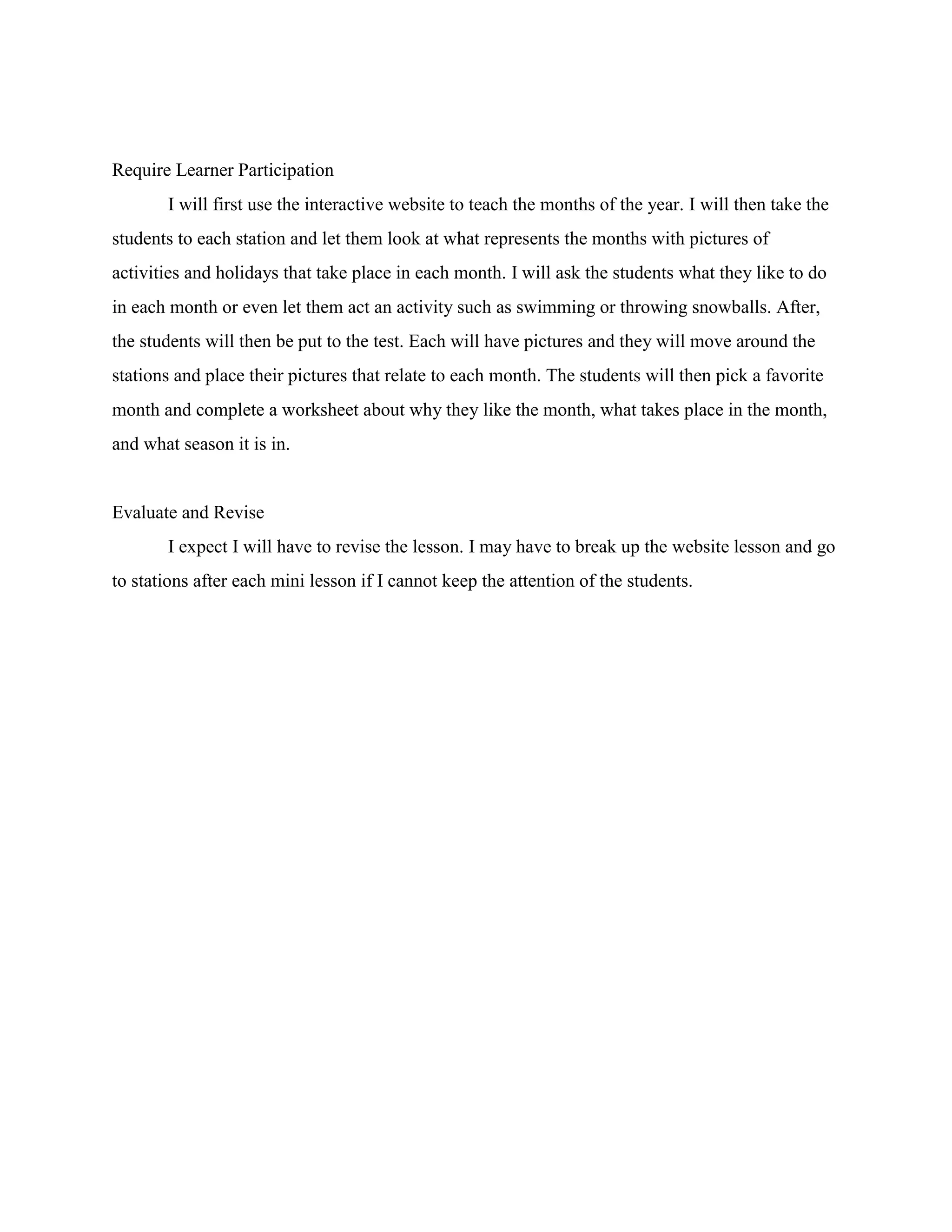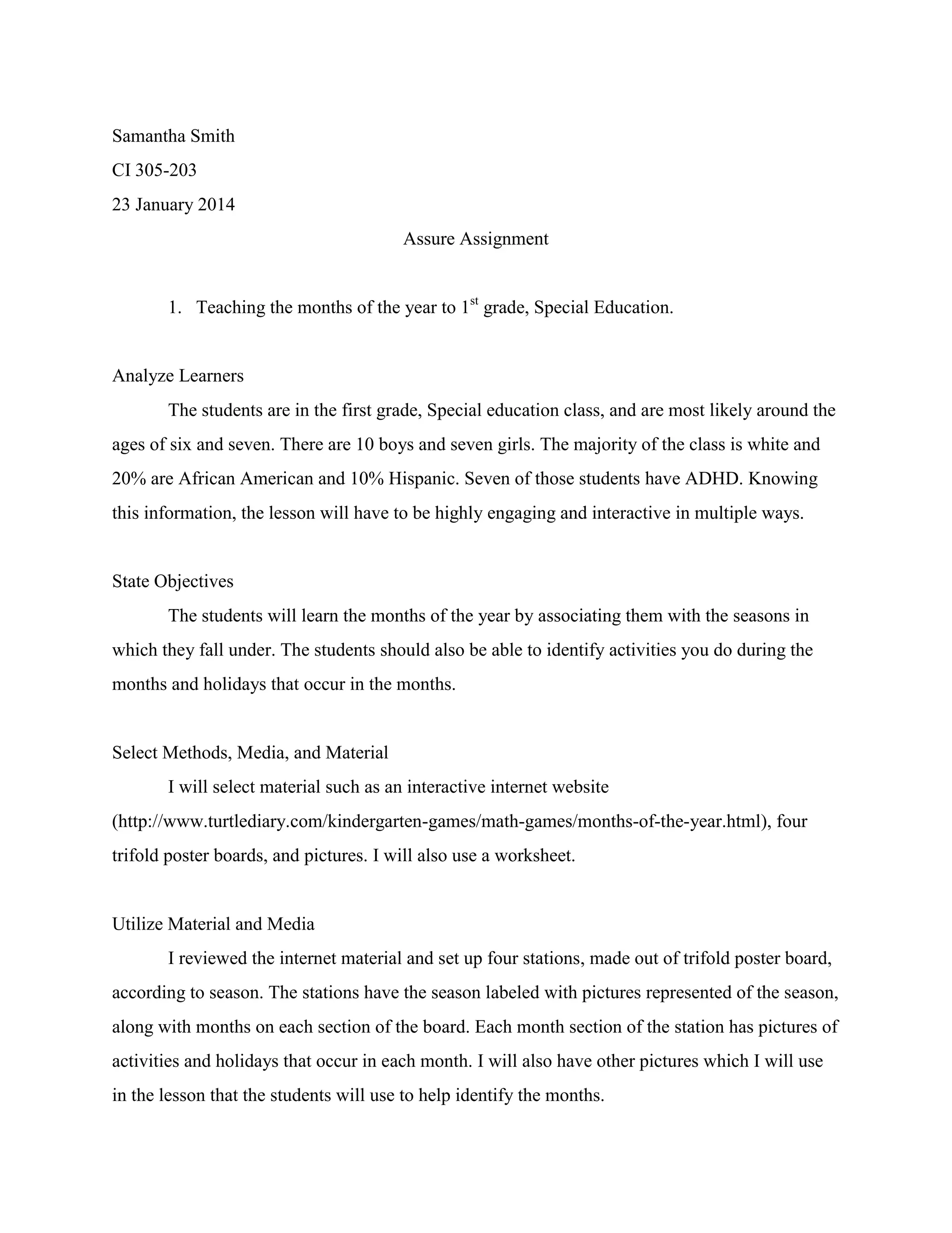 This document provides a lesson plan for teaching first grade special education students the months of the year. It analyzes the learners as being 6-7 years old, with most being white but some African American and Hispanic. Seven have ADHD. The objectives are for students to learn the months and associate them with seasons, identifying activities and holidays. The lesson will use an interactive website, poster boards divided into seasonal stations with pictures of months, activities and holidays. Students will participate by using the website, exploring the stations, acting out activities, and completing a worksheet identifying their favorite month. The lesson may need revising, such as breaking up the website portion into smaller chunks.