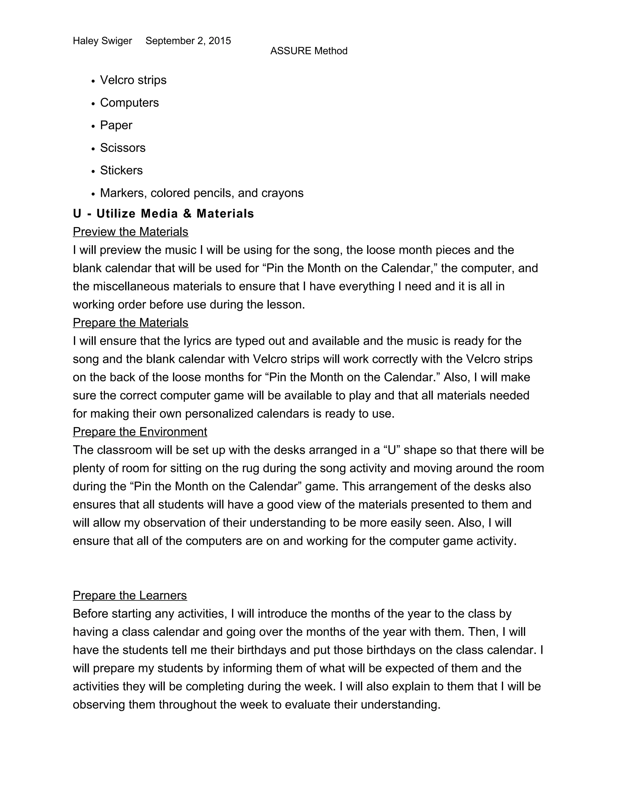 The teacher will teach 1st grade students the months of the year using the ASSURE method over the course of a week. She will use several methods - singing a song, playing "Pin the Month on the Calendar", an interactive computer game, and having students make their own calendars. Materials will include the song lyrics, a blank calendar, notecards with months, computers, and art supplies. Throughout the week, the teacher will observe students to evaluate their understanding and participation. At the end, she will individually evaluate students on their knowledge of the months and get feedback to help revise future lessons.