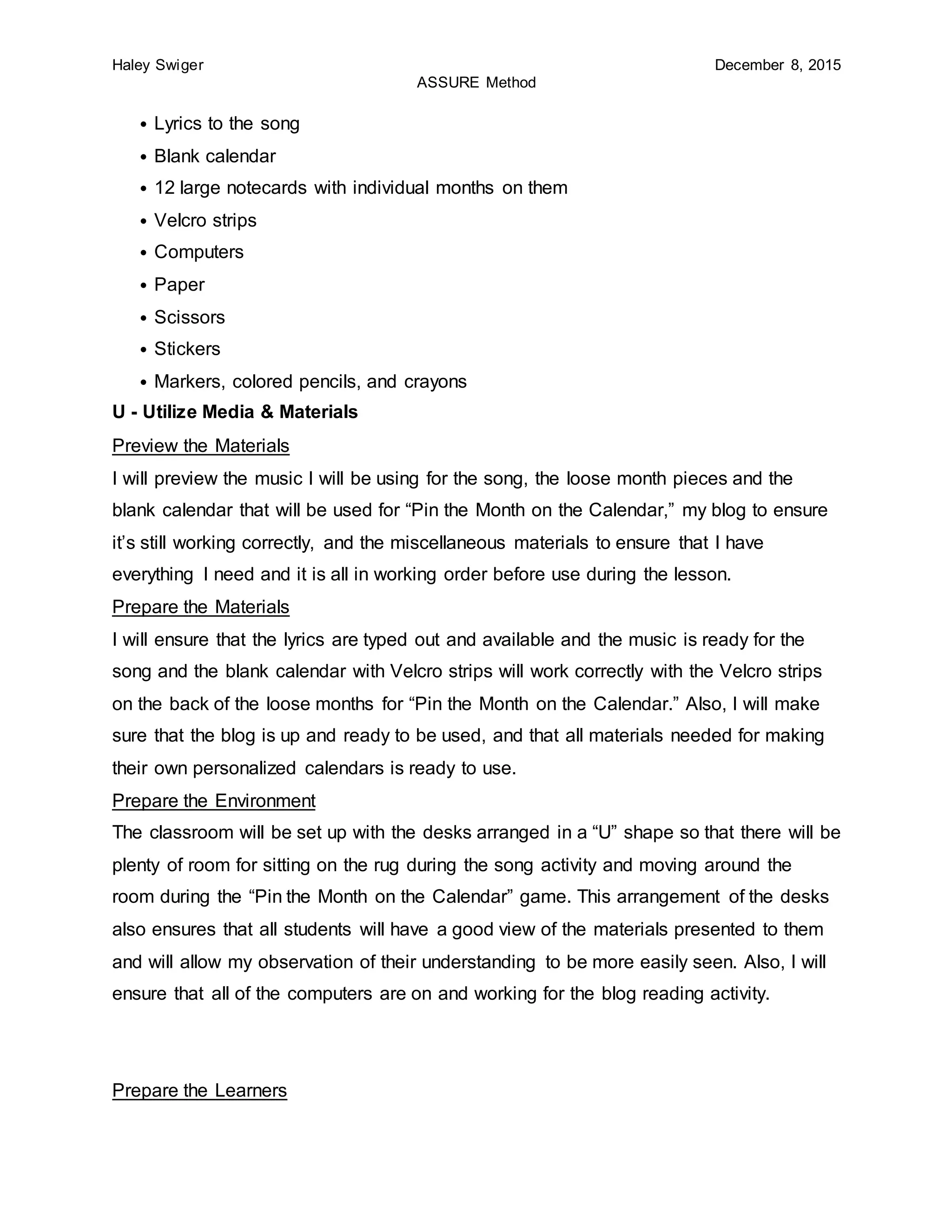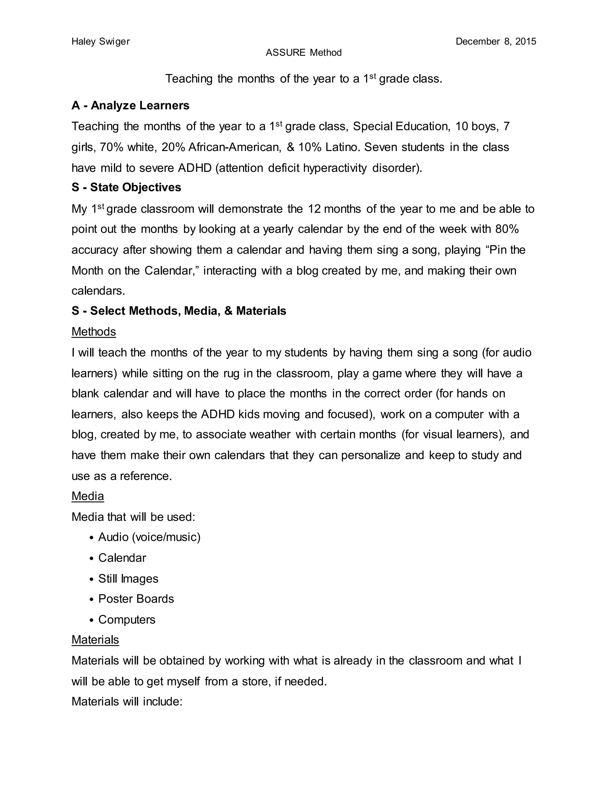 Haley Swiger outlines a lesson plan using the ASSURE method to teach the months of the year to a diverse 1st grade class, including students with ADHD. The plan includes various engaging activities, such as singing, games, and personalized calendar creation, to cater to different learning styles. Evaluation will occur through participation observations and individual demonstrations at the end of the week to inform future teaching strategies.