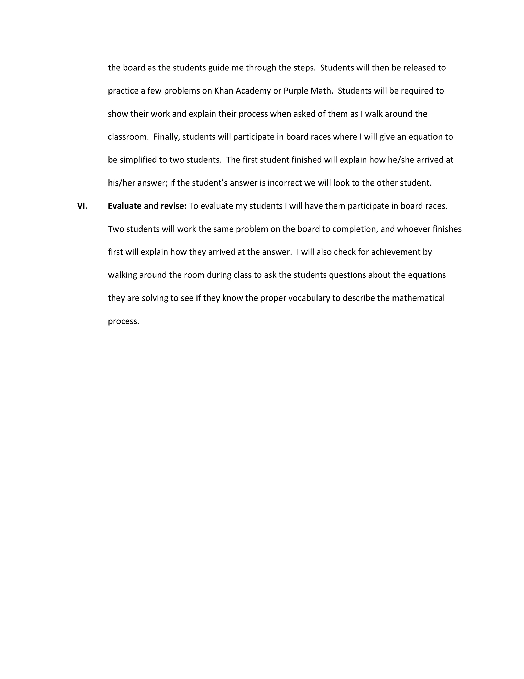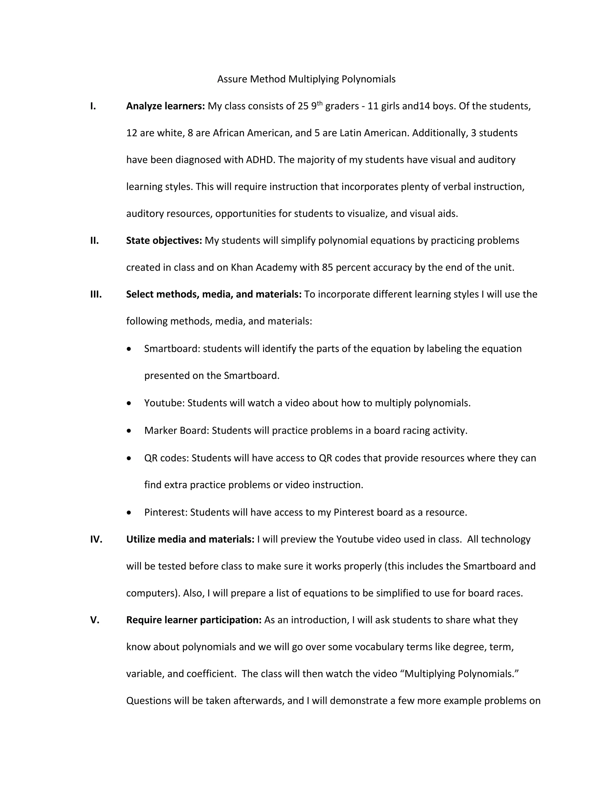 This document outlines a lesson plan for teaching 9th grade students how to multiply polynomials. The class has 25 students from diverse racial and learning style backgrounds. The objectives are for students to simplify polynomial equations with 85% accuracy. The lesson incorporates visual, auditory, and hands-on methods like using a Smartboard, YouTube video, marker board races, QR codes, and a Pinterest board. Students will participate by discussing what they know about polynomials, watching an instructional video, practicing problems, and explaining their work in board races. Their understanding will be evaluated through board races and the teacher checking on individual students as they work.
