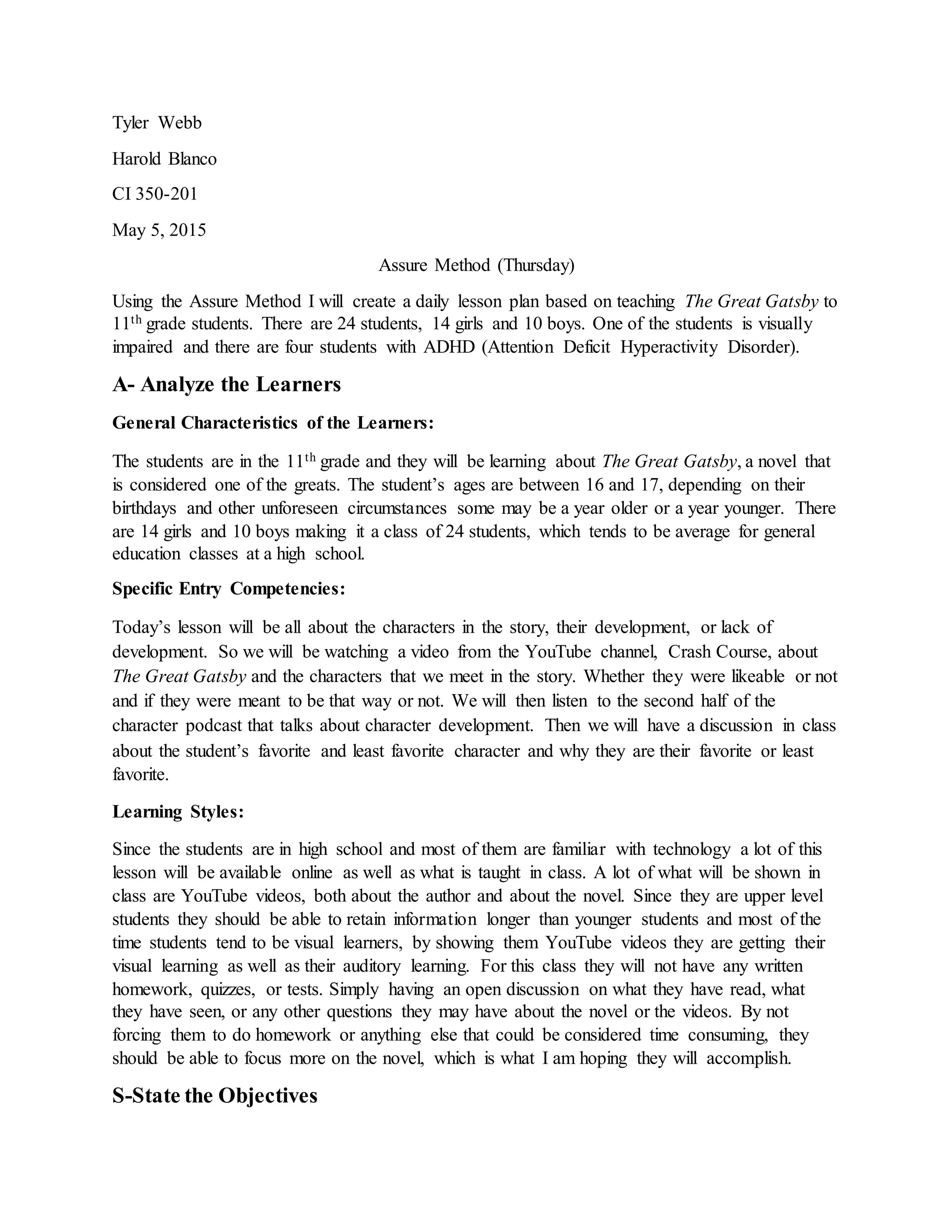 This document outlines a lesson plan for teaching The Great Gatsby to an 11th grade class using the Assure method. The class has 24 students including 14 girls and 10 boys, one with visual impairment and four with ADHD. The lesson plan involves analyzing the learners, stating objectives to have students understand key elements of the novel, selecting YouTube videos and a podcast to teach characters, and requiring student participation through discussion and a Twitter poll. The teacher will evaluate and revise the lesson daily based on student performance and understanding.